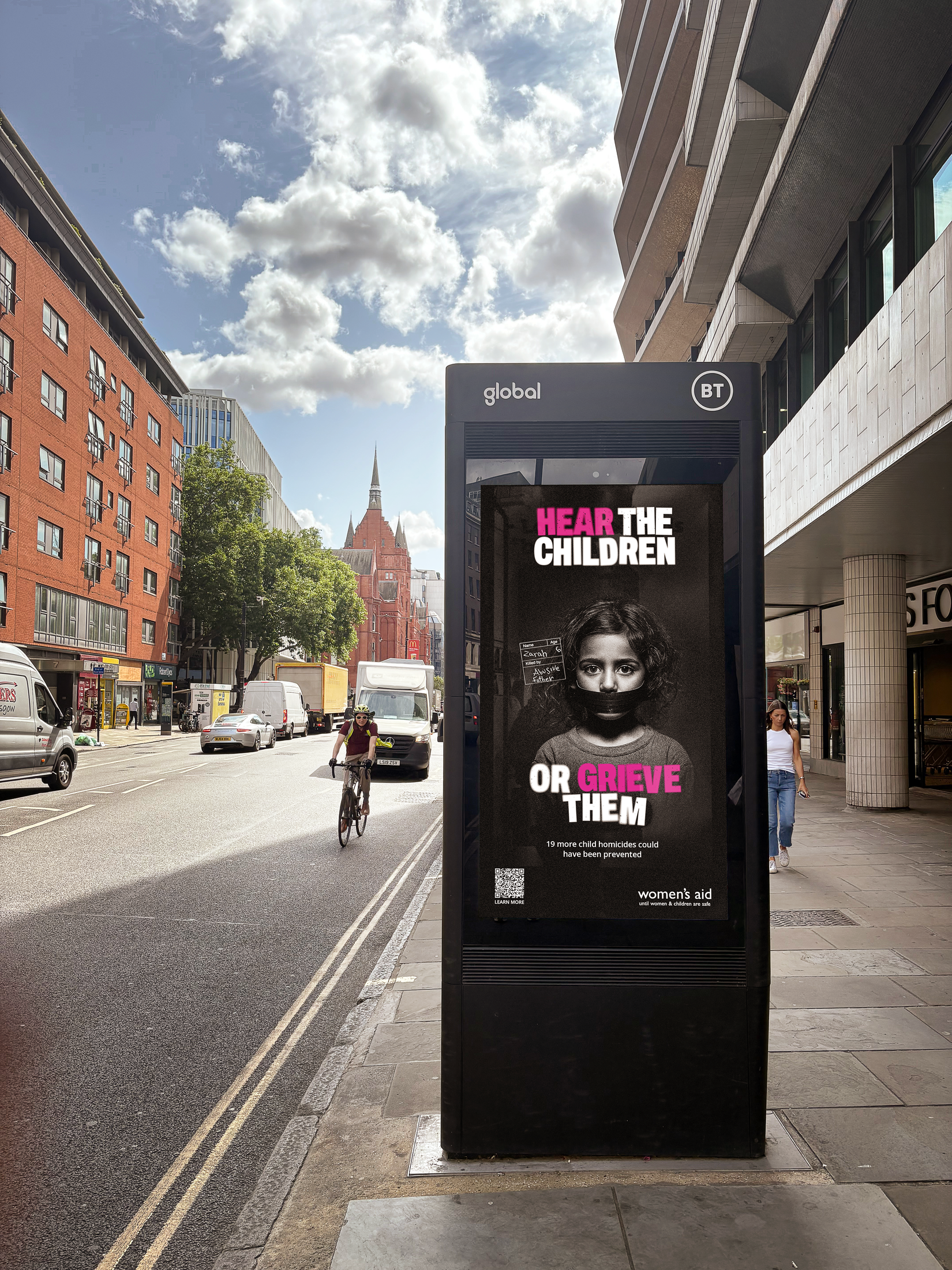 This professional campaign titled 'Hear the Children or Grieve Them' was published in United Kingdom in June, 2025. It was created for the brand: Women's Aid, by ad agency: Hijinks. This OOH Outdoor medium campaign is related to the Health and Public Interest industries and contains 4 media assets. It was submitted 5 months ago.