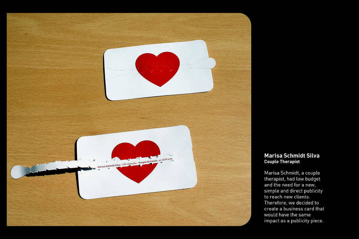This professional campaign titled 'Heart' was published in Brazil in March, 2008. It was created for the brand: Marisa Schmidt, by ad agency: Master Promo. This Static Images medium campaign is related to the Professional Services industry and contains 1 media asset. It was submitted over 17 years ago.