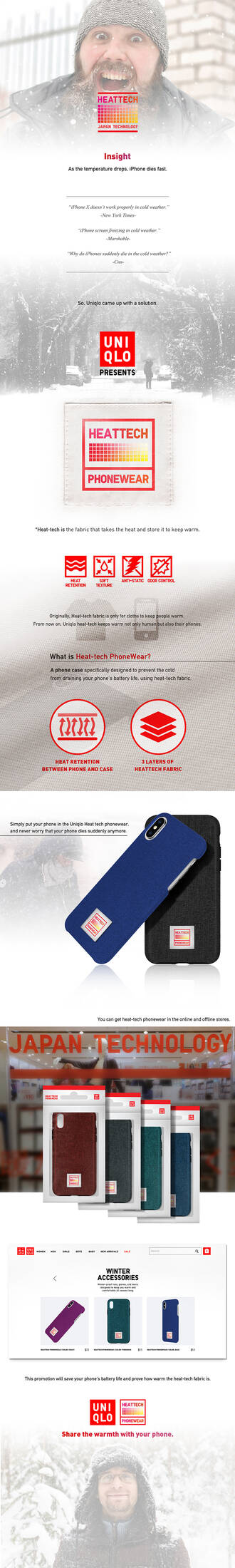 As the temperature drops, iPhone dies fast. Uniqlo will promote the phone case that made with Heat-tech fabric. So, It can keep warm the phone, and people don't need to worry that their phones die suddenly in the cold weather. Also, Uniqlo can promote their superiority of Heat-tech fabric by figuring out people's problem.