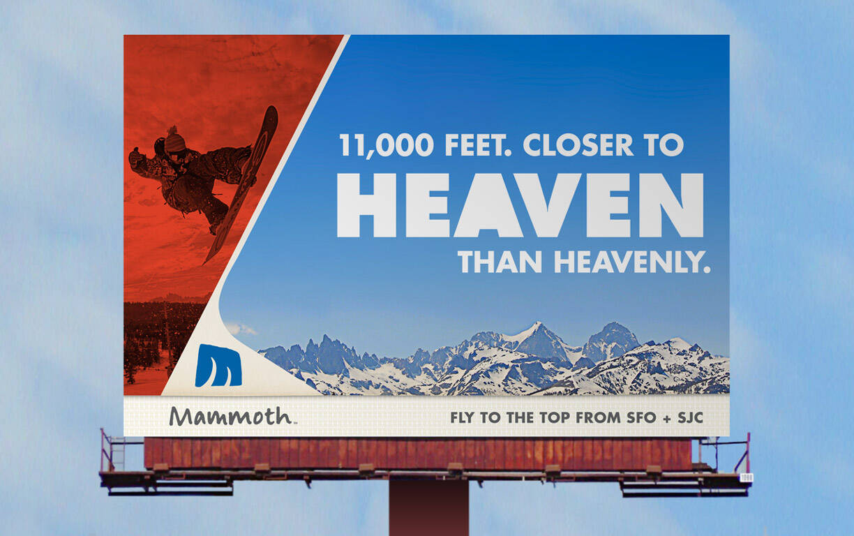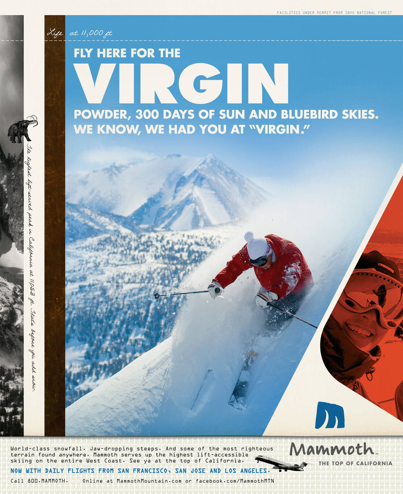 This professional campaign titled 'Heaven, Carving knife, Take off, , Virgin powder' was published in United States in January, 2011. It was created for the brand: Mammoth Mountain Ski Resort, by ad agency: Colle+McVoy. This OOH Outdoor medium campaign is related to the Transport industry and contains 5 media assets. It was submitted almost 15 years ago.