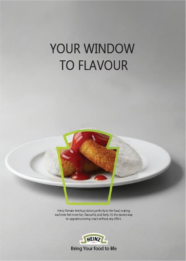This campaign shows that without Heinz, food is just "gray noise"—boring, dry, and lifeless. By keeping the background in black and white, I highlight the blandness of an everyday snack. The famous Heinz bottle shape acts as a magic window that brings the color back. Inside that window, the food is bright, juicy, and full of flavor. The message is simple: Heinz doesn't just add sauce; it turns a dull meal into a vibrant experience. It’s the "filter" that brings your food to life.