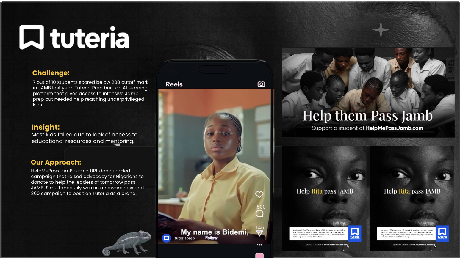 This professional campaign titled 'Help Me Pass JAMB' was published in Nigeria in April, 2026. It was created for the brand: Tuteria, by ad agency: This&That Creative Agency. This 360°, Film, and OOH Outdoor media campaign is related to the Education industry and contains 8 media assets. It was submitted 3 days ago by The Chameleon People of This&That Creative Agency .