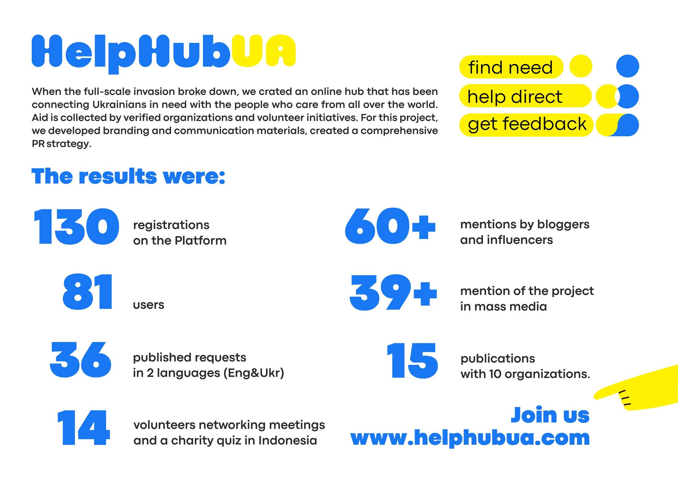 We wanted to find a simple but meaningful image for the project, because the identity had to be equally clear to benefactors from different countries. Thus, we came up with the naming: HelpHubUA. It fully conveys the idea of the project, it resembles a meeting place of good people and those who need help.