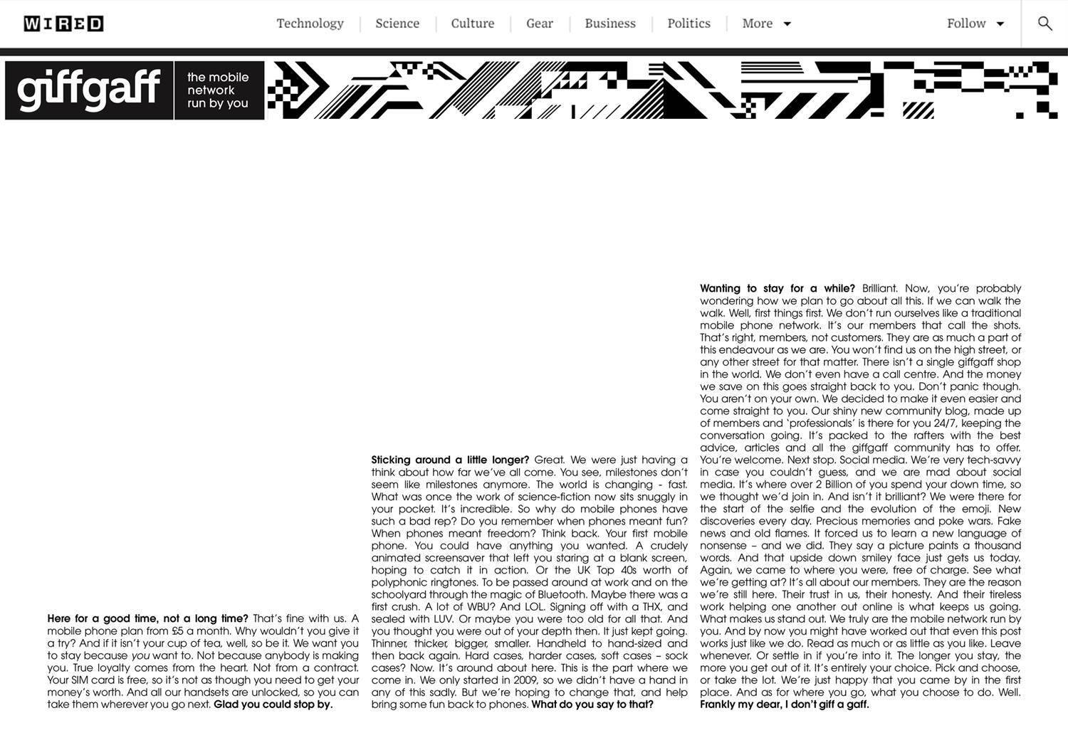 I created this work from a brief set by giffgaff and D&AD for the New Blood Awards 2019. The mobile phone network giffgaff wanted to tell their story. Whilst most people will be familiar with their line ‘the mobile network run by you’, the majority won’t really know what they mean by this. They wanted 800 words of long copy and some follow up social media content. I based my copy around the idea of nostalgia and the early days of mobile phones, and how much has changed in such a short space of time. I created what would be a sponsored online article split into three sections. The article works like giffgaff do, you can stay as long as you want or leave whenever. However much you choose to read, you will still come away knowing the brand’s story, but the longer you stay, the more you get out of it – just like being a giffgaff customer. This work went on to win a New Blood Pencil.