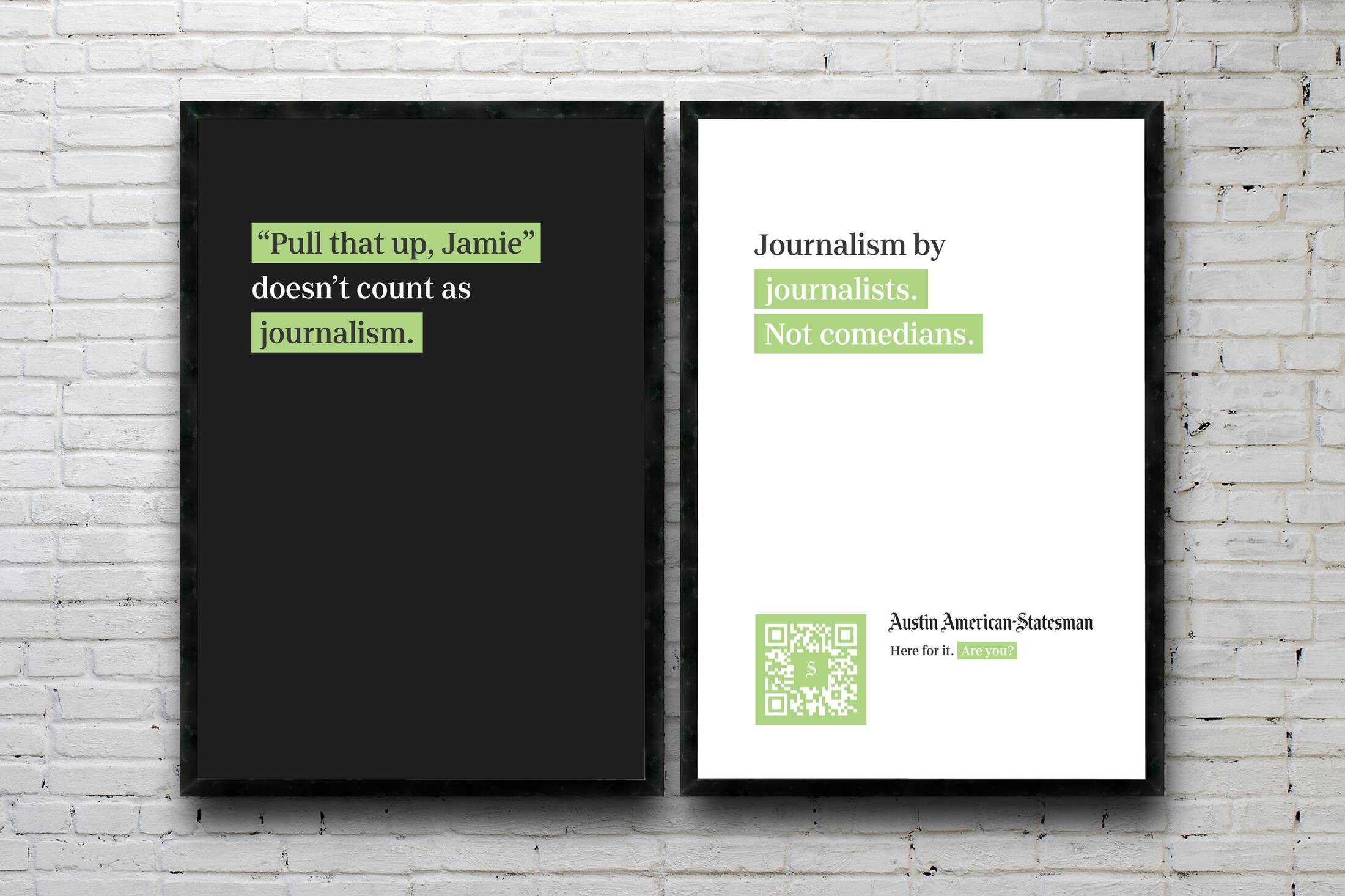 “‘Pull that up, Jamie doesn’t count as journalism. / Journalism by journalists. Not comedians,” reads an Austin OOH pairing, a reference to influential but untrained online personalities.