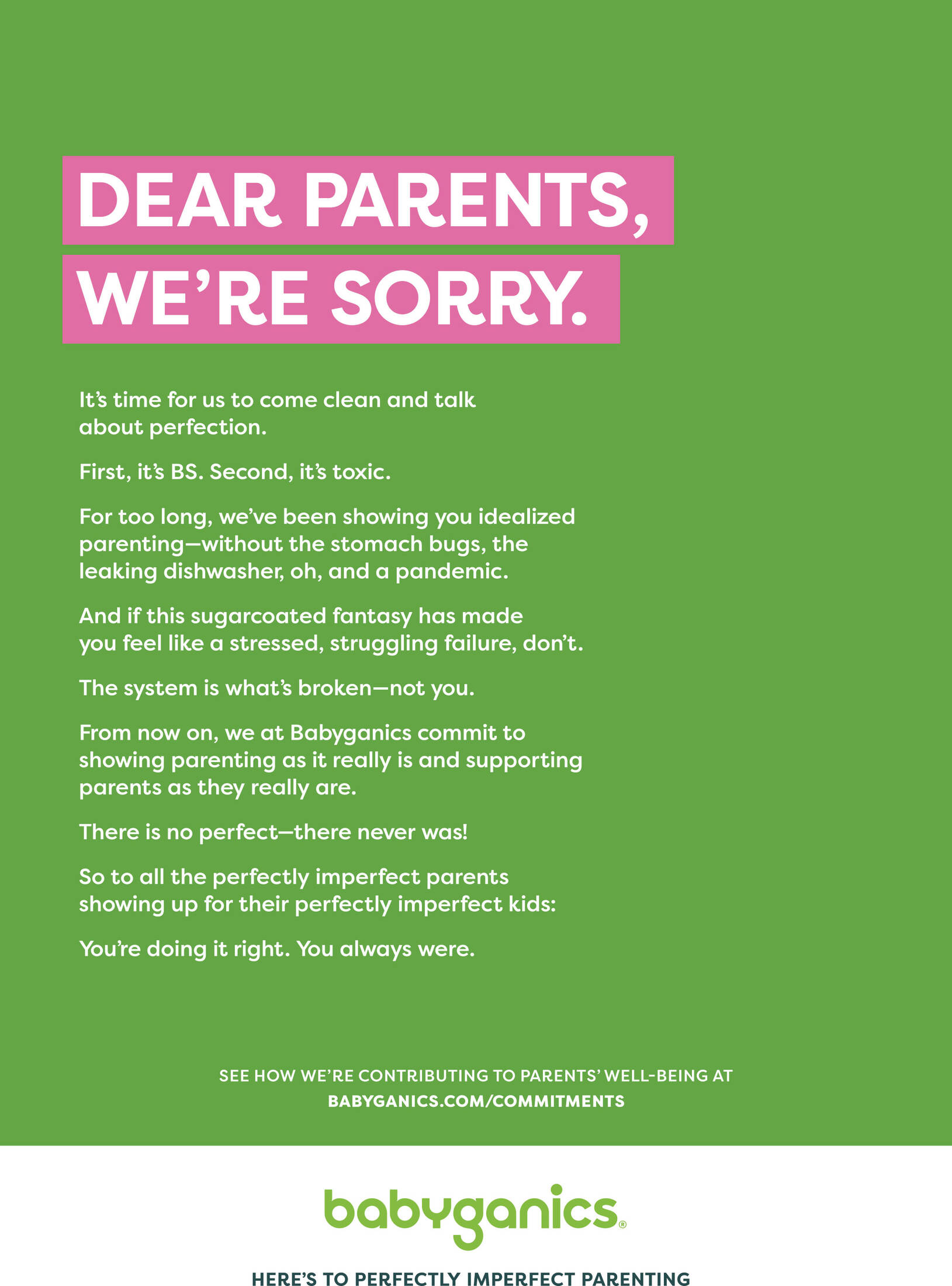 This professional campaign titled 'Here's to Perfectly Imperfect Parenting' was published in United States in October, 2021. It was created for the brand: Babyganics, by ad agency: Red & Co.. This Integrated medium campaign is related to the Retail Services industry and contains 2 media assets. It was submitted about 4 years ago by Founder: Kristen Bryan of KBPR.
