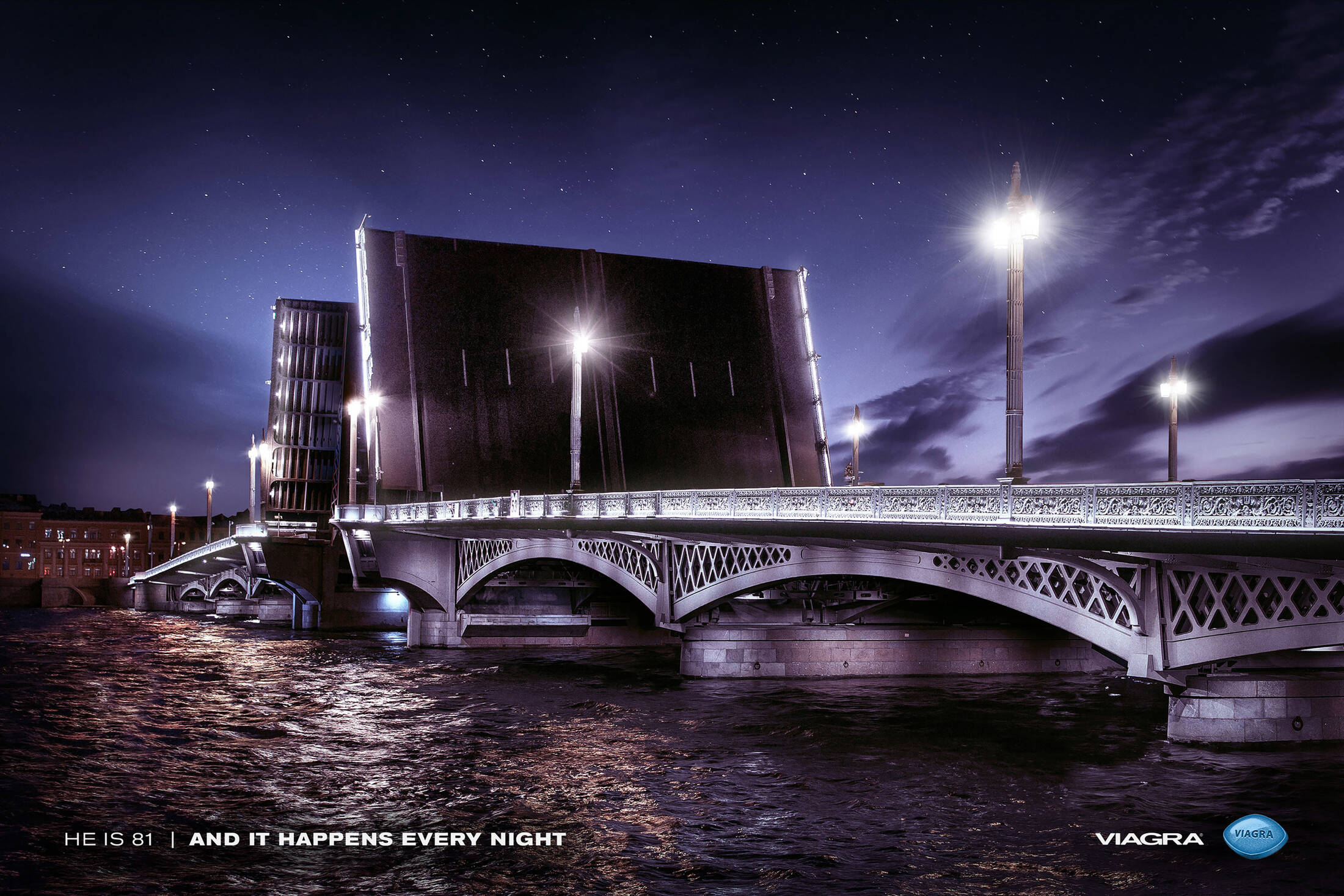 It doesn't take an expert to see what an erected drawbridge looks like. However, to dig the idea deeper and map it to the brand and the audience one needs to think with the right head. The St. Petersburg (Russia) drawbridges are raised every night for eight months a year and they are never too old for that. Viagra performs the same ironclad, rock-solid magic for men too mature of age. There are some counter-indications so please consult a physician. And don’t forget to ask your lover or your wife — perhaps they aren’t ready for your bridge standing upright till 5 in the morning. The age of the bridges is calculated according to the dates of the last span retrofitting.