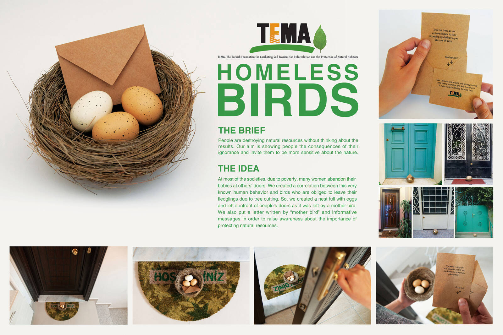 This professional campaign titled 'Homeless Birds' was published in Turkey in July, 2011. It was created for the brand: TEMA, by ad agency: Leo Burnett. This Static Images medium campaign is related to the Public Interest industry and contains 1 media asset. It was submitted over 14 years ago.