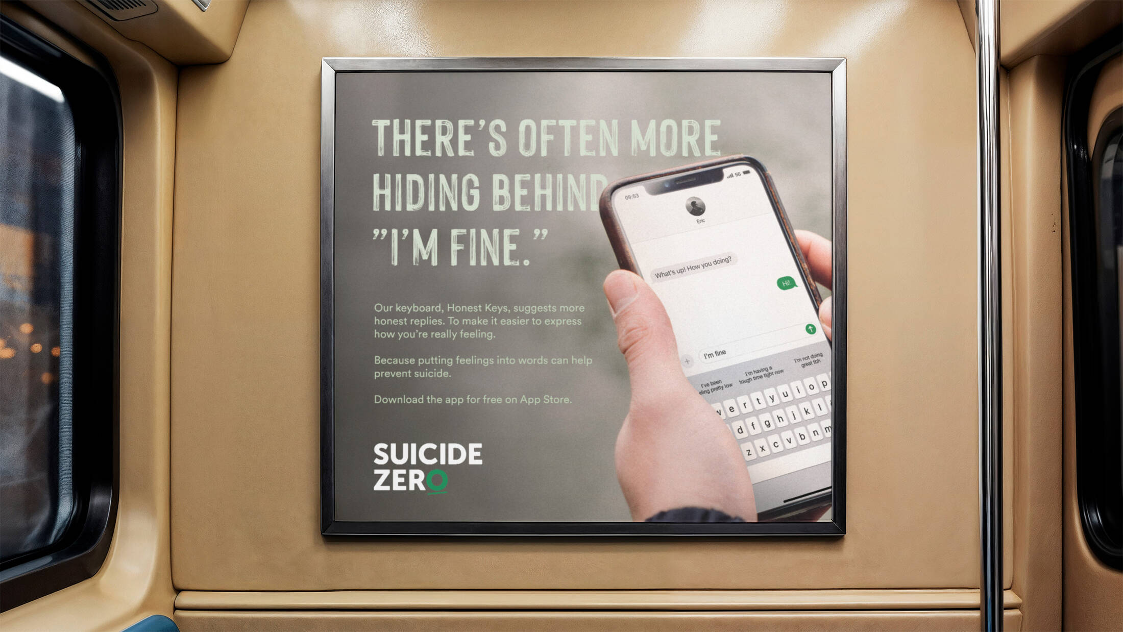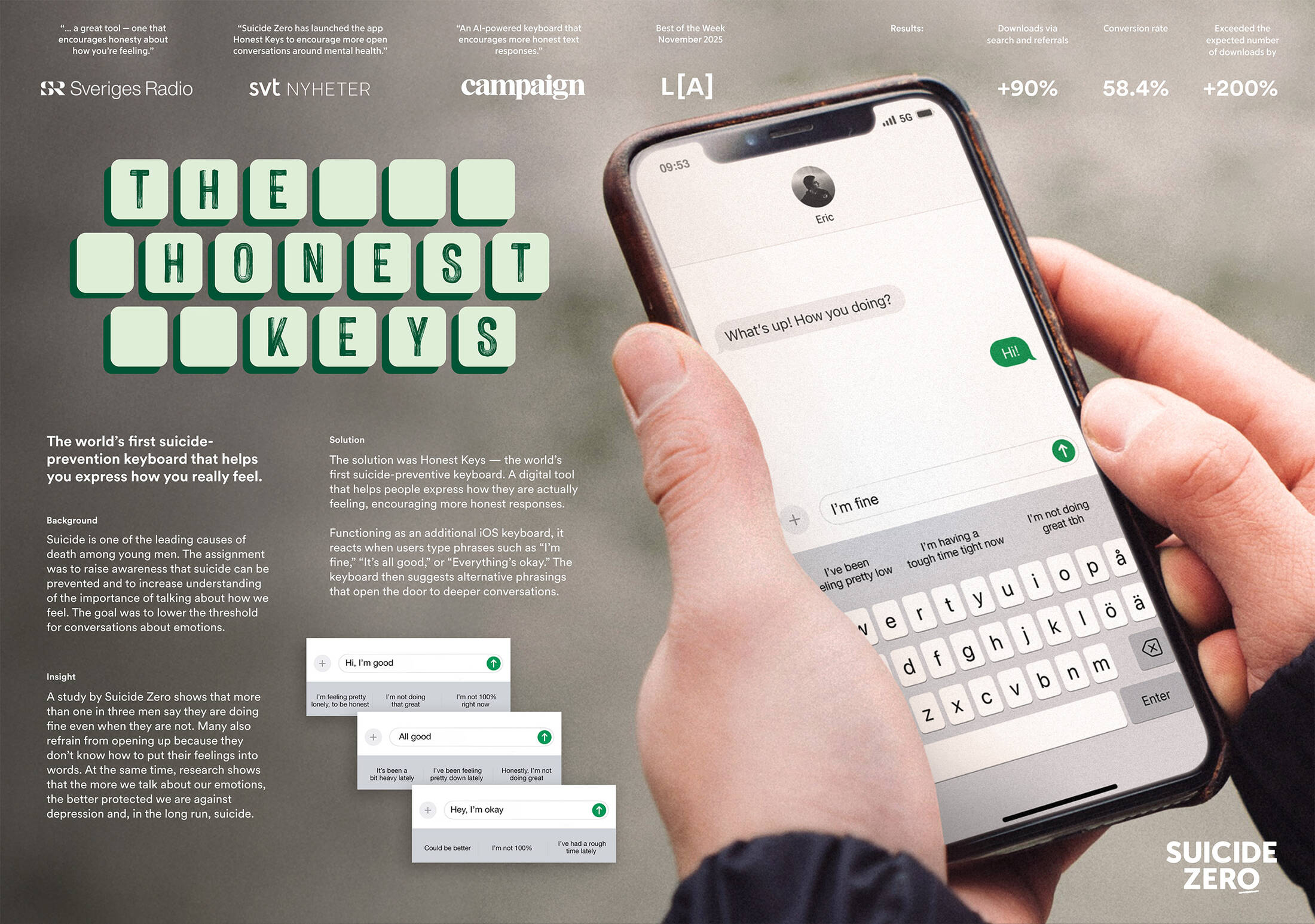 “The Honest Keys”: (“Ärliga Tangenter” in Swedish) functions as an add-on keyboard that users download via App Store and activate in their iOS settings – just like an emoji or language keyboard. It acts by detecting messages that signal poor mental health in the user, such as “I’m fine,” “It’s all good,” or “Everything’s okay”, which prompt the app’s autosuggest feature to react. It then suggests alternatives for more honest responses, such as “I’m actually not doing that well” or “It’s been a bit tough lately.” Created by suicide prevention charity Suicide Zero, the app makes it easier to take that first step of being honest and asking for help.
