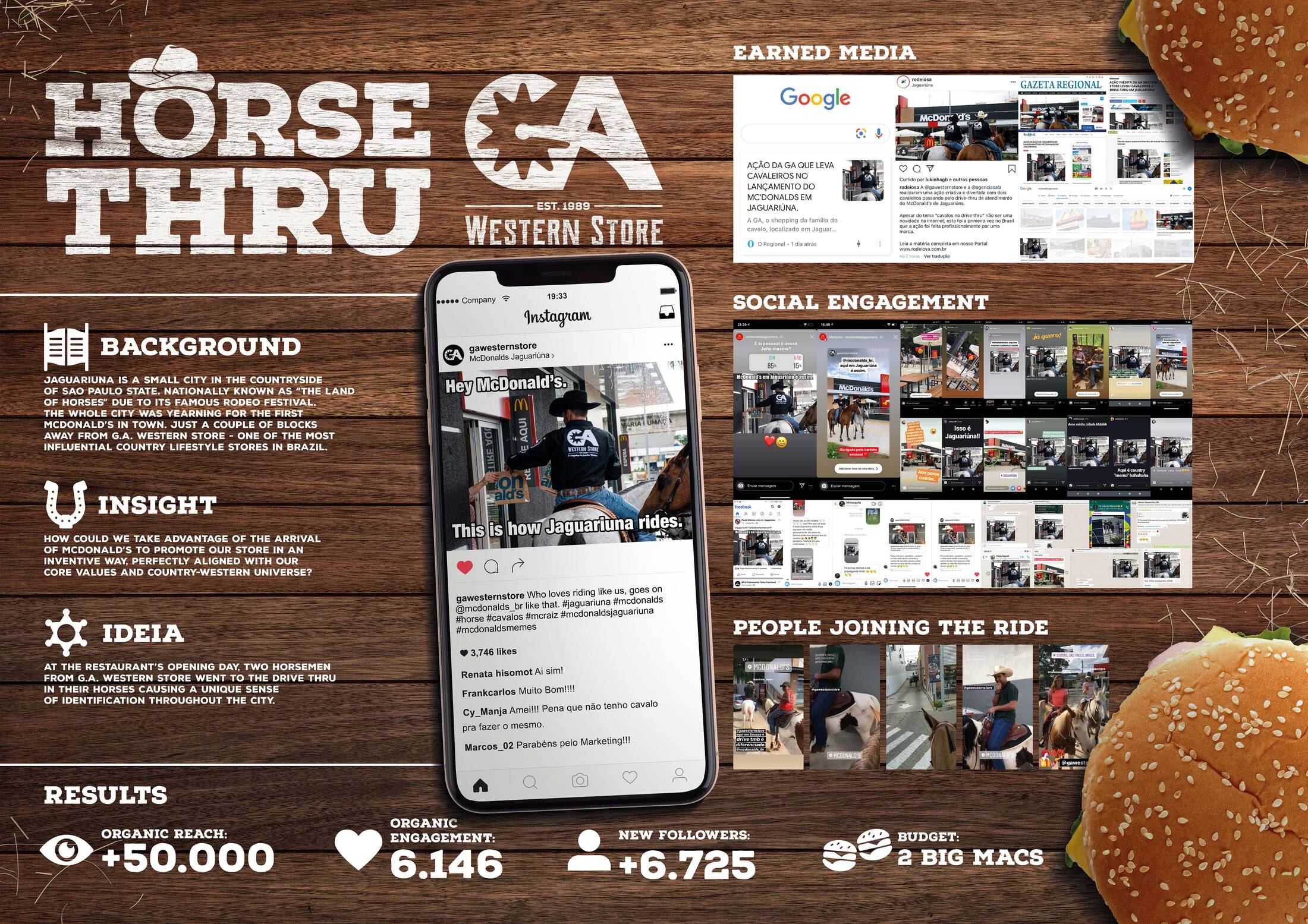 This professional campaign titled 'Horse Thru' was published in Brazil in November, 2022. It was created for the brand: G.A. Western Store, by ad agency: Agência SALA. This Ambient, Content, and Digital media campaign is related to the Fashion industry and contains 1 media asset. It was submitted over 2 years ago by CCO: Fabio Wanderley of Agência SALA.