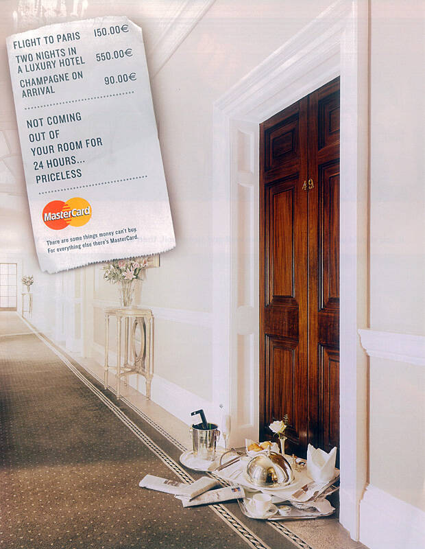 This professional campaign titled 'Hotelroom' was published on October 01, 2005. It was created for the brand: MasterCard, . This Print medium campaign is related to the Finance industry and contains 1 media asset. It was submitted about 20 years ago.