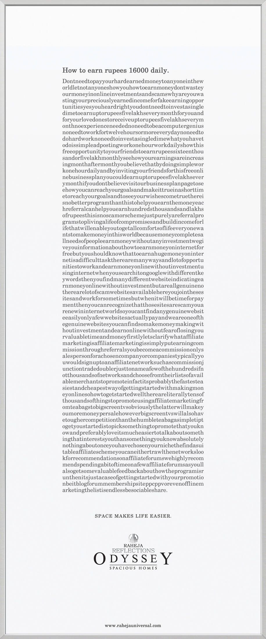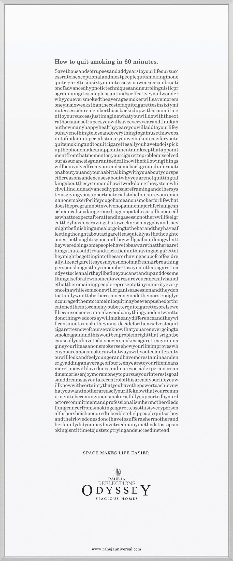 This professional campaign titled 'How to quit, How to lose, How to earn' was published in India in November, 2012. It was created for the brand: Odyssey Raheja Universal, by ad agency: Makani. This Print medium campaign is related to the Industrial industry and contains 3 media assets. It was submitted over 12 years ago.