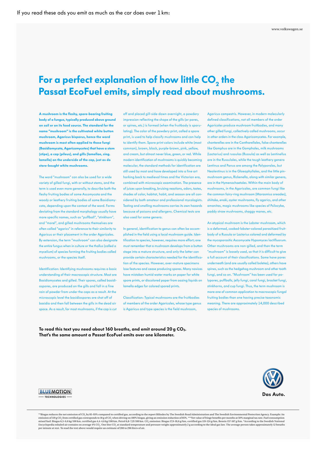 This professional campaign titled 'Human emissions, Mushrooms, Human emissions, Recepies' was published in Sweden in December, 2009. It was created for the brand: Volkswagen, by ad agency: DDB. This Print medium campaign is related to the Automotive and Personal Transportation industry and contains 2 media assets. It was submitted about 16 years ago.