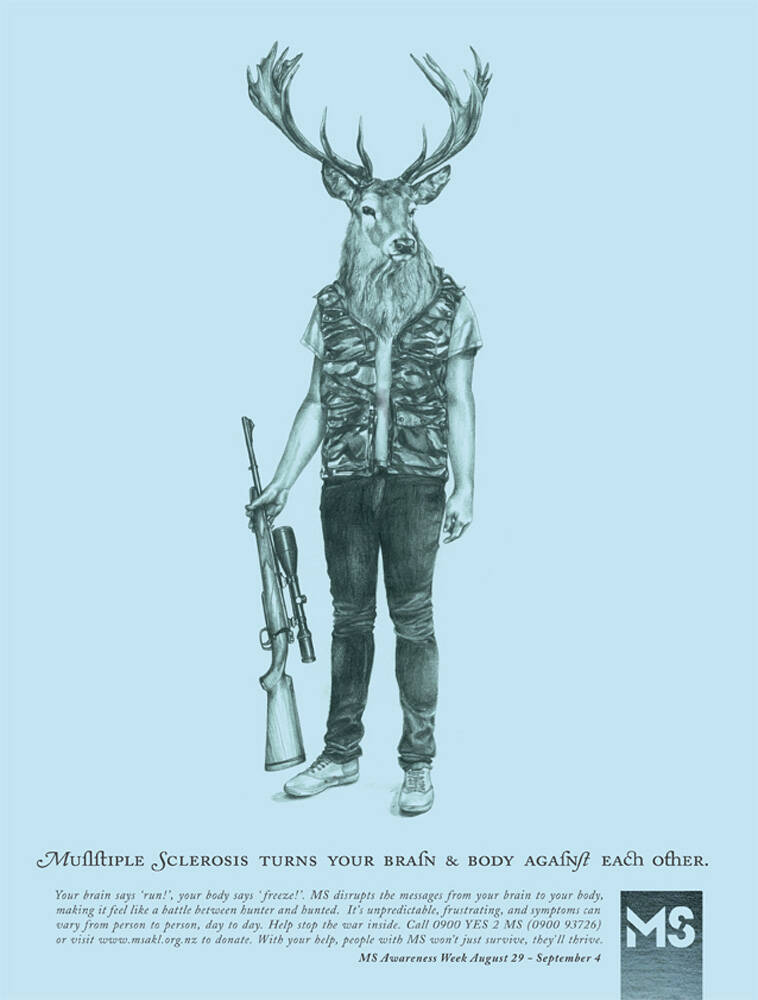 This professional campaign titled 'Hunter vs Deer, Cat vs Dog' was published in New Zealand in September, 2010. It was created for the brand: Multiple Sclerosis Society, by ad agency: TBWA. This Print medium campaign is related to the Public Interest industry and contains 2 media assets. It was submitted about 15 years ago.