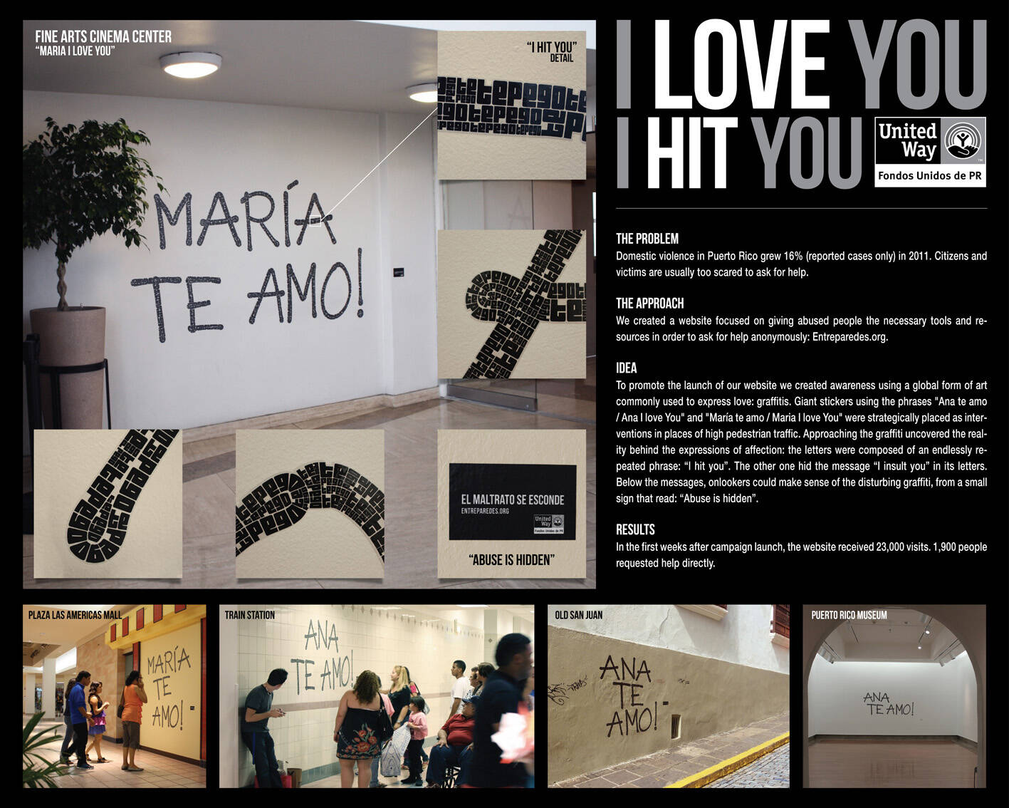 To promote the launch of our website Entreparedes.org, we created awareness using a global form of art commonly used to express love: graffitis. Giant stickers using the phrases “Ana te amo / Ana I love You” and “María te amo / Maria I love You” were strategically placed as interventions in places of high pedestrian traffic. Approaching the graffiti uncovered the reality behind the expressions of affection: the letters were composed of an endlessly repeated phrase: “I hit you”. The other one hid the message “I insult you” in its letters. Below the messages, onlookers could make sense of the disturbing graffiti, from a small sign that read: “Abuse is hidden”.