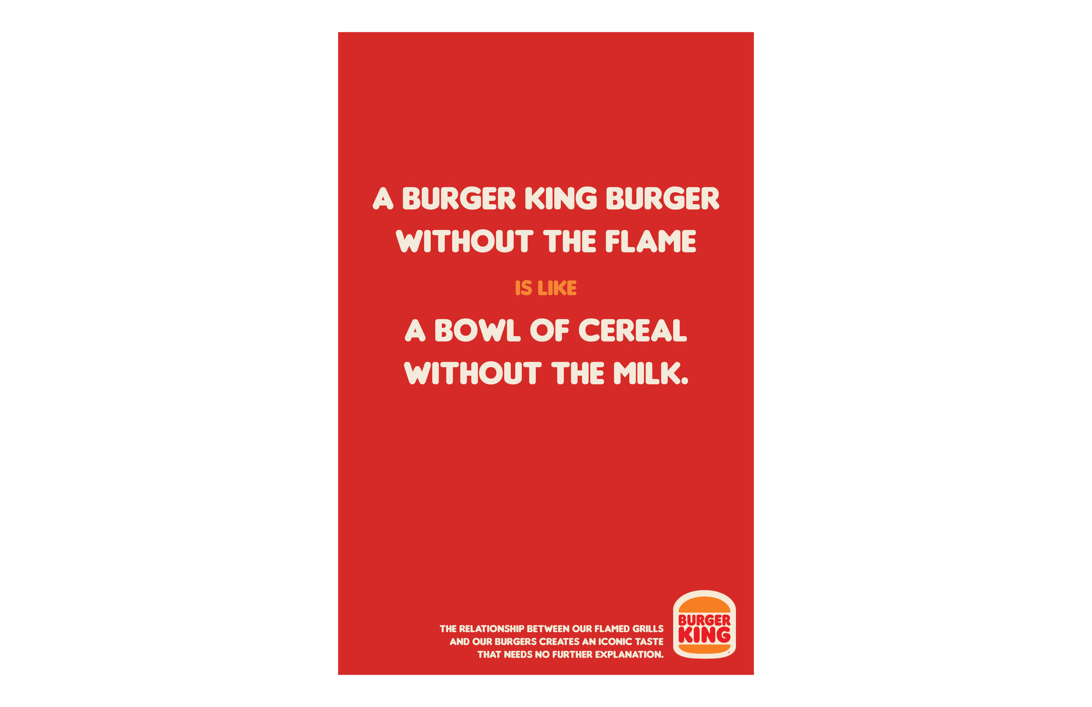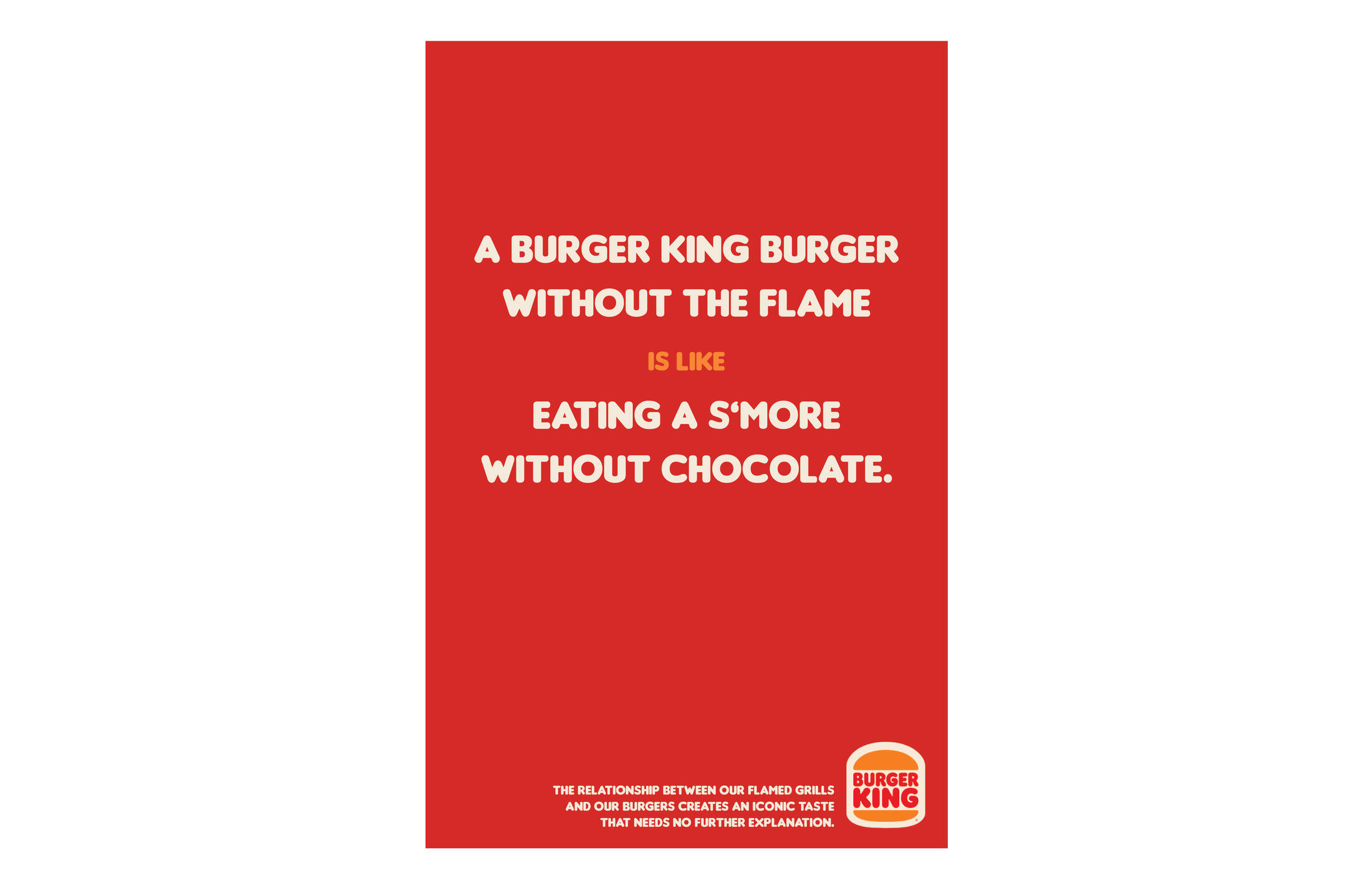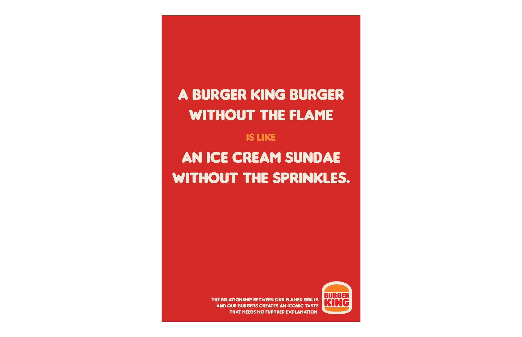 Based on the insight burgers that are flame grilled have an iconic taste, the big idea created was that without the flame, Burger King burgers would be just another fast-food burger.