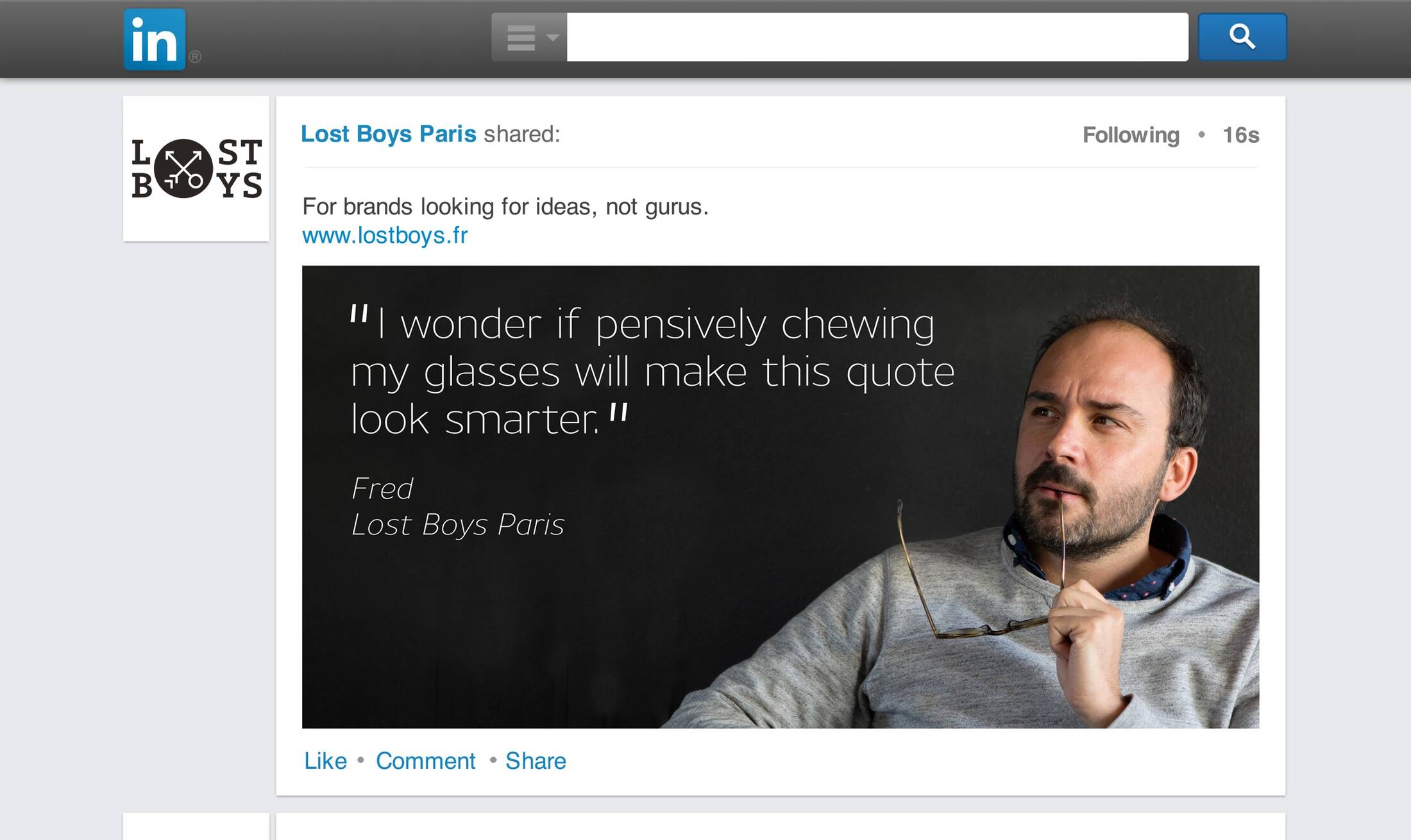 This professional campaign titled 'Ideas, not gurus' was published in France in October, 2015. It was created for the brand: Lost Boys Paris, by ad agency: Lost Boys. This Print medium campaign is related to the Agency Self-Promo industry and contains 7 media assets. It was submitted about 10 years ago.
