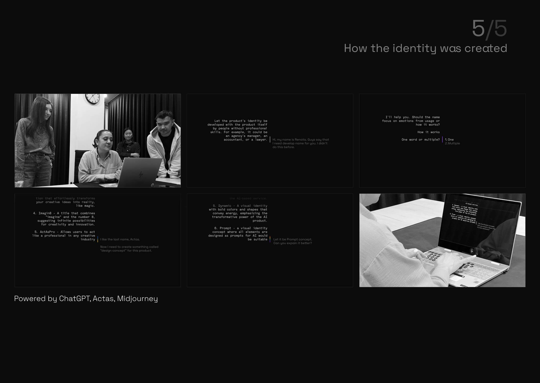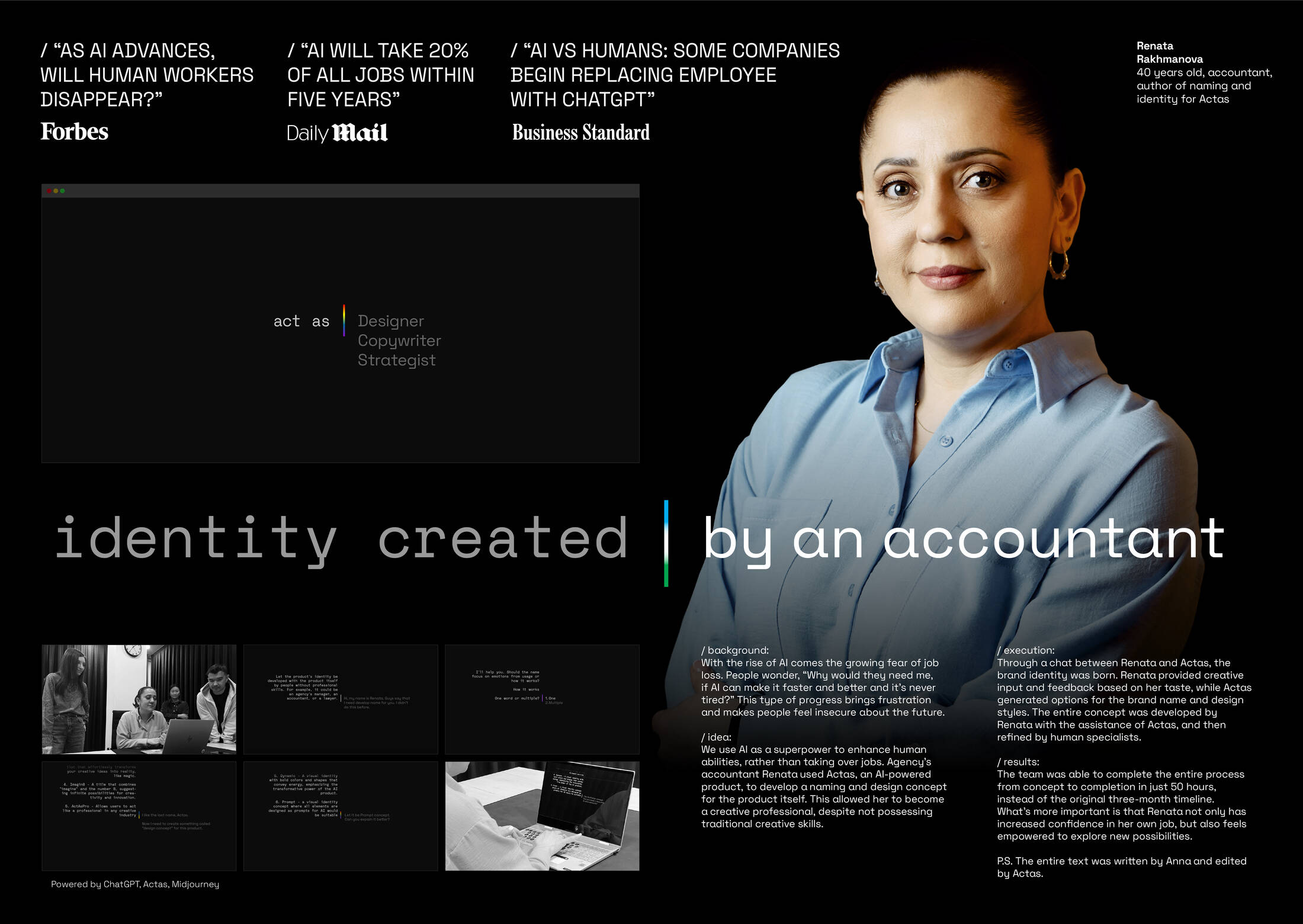 We use AI as a superpower to enhance human abilities, rather than taking over jobs. Agency's accountant Renata used Actas, an AI-powered product, to develop a naming and design concept for the product itself. This allowed her to become a creative professional, despite not possessing traditional creative skills.