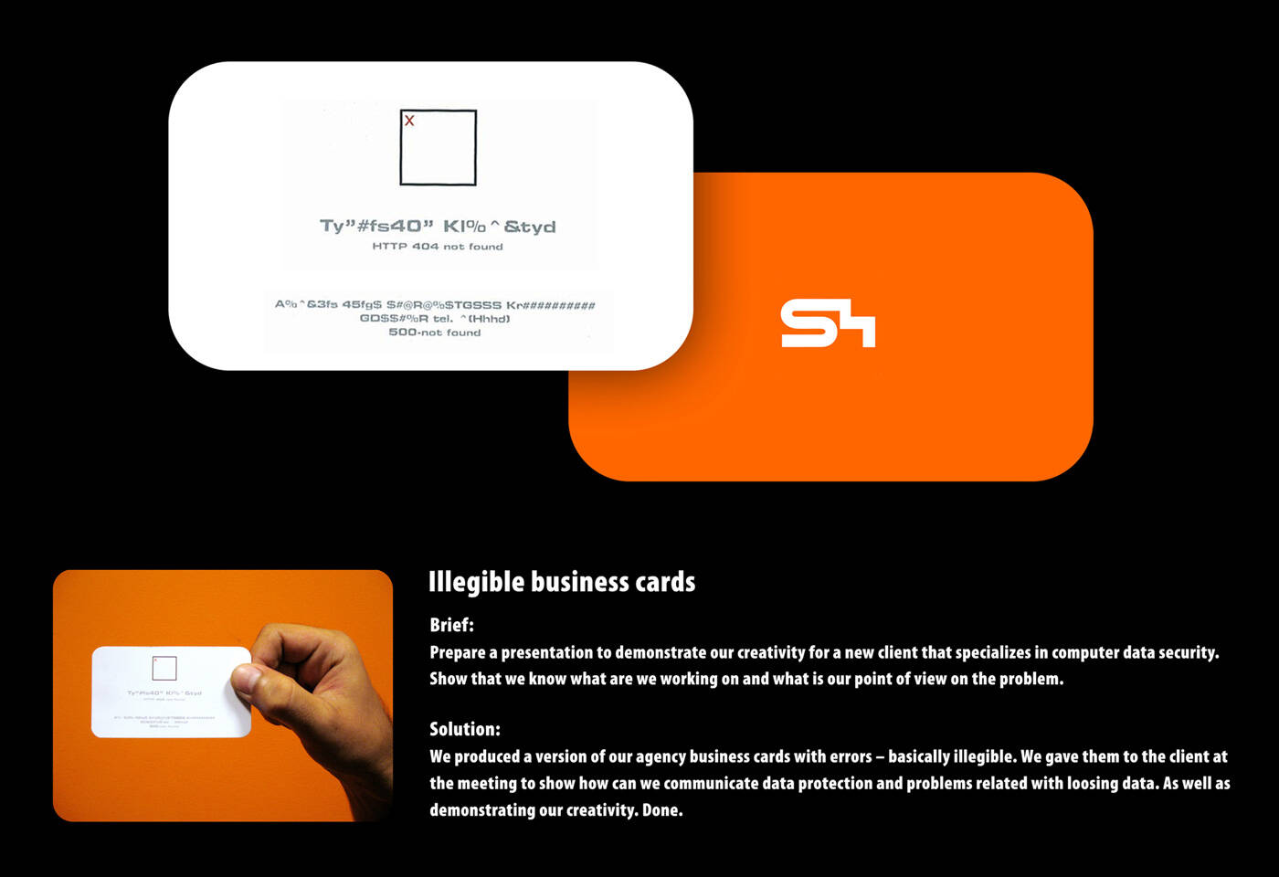 This professional campaign titled 'Illegible business cards' was published in Poland in July, 2009. It was created for the brand: S4, by ad agency: S4. This Static Images medium campaign is related to the Agency Self-Promo industry and contains 1 media asset. It was submitted over 16 years ago.