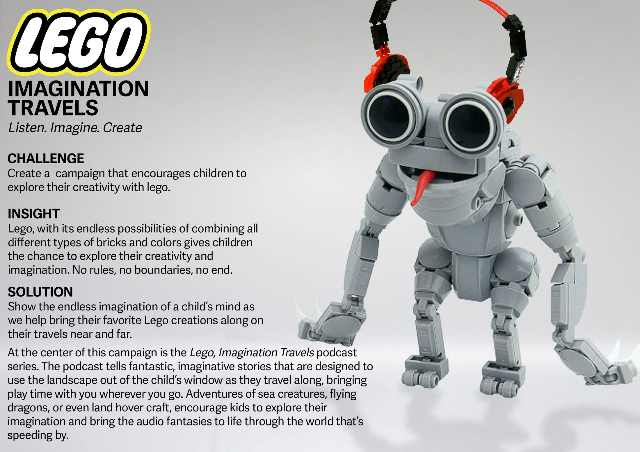 Can we take the boredom of sitting in the back seat for a road trip as a child and turn it into a playful and interesting experience - without getting out the iPad? That's what Imagination Travels was made for. Using location data and the imagination of Lego playtime pros, kids can now bring their favorite creations along with them on any journey and hear them come to life along the way.