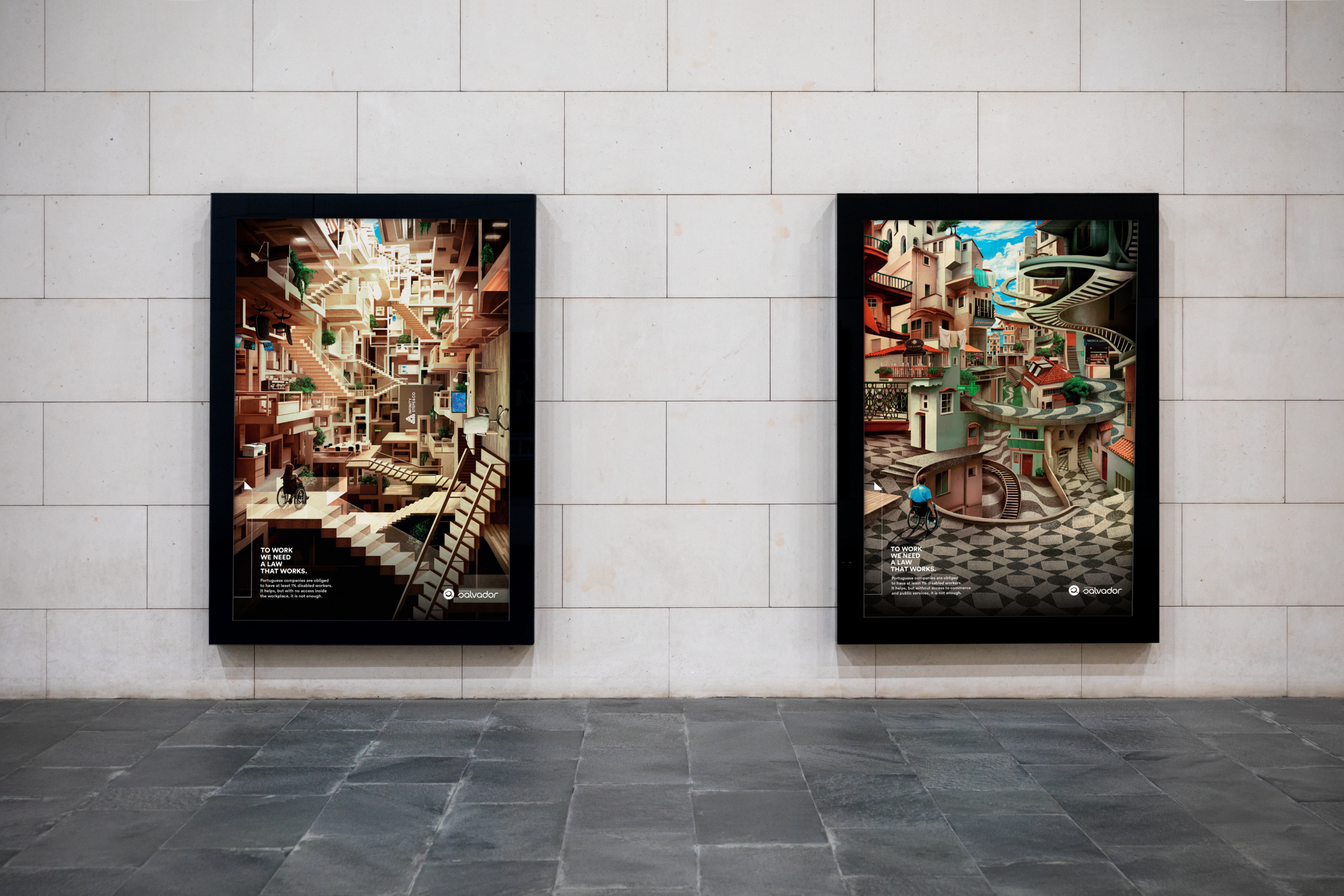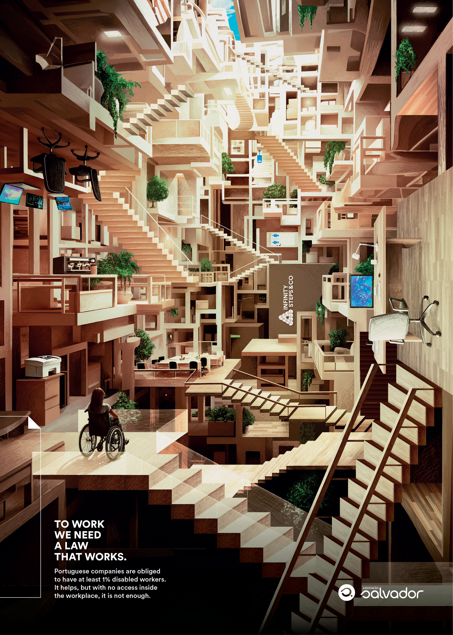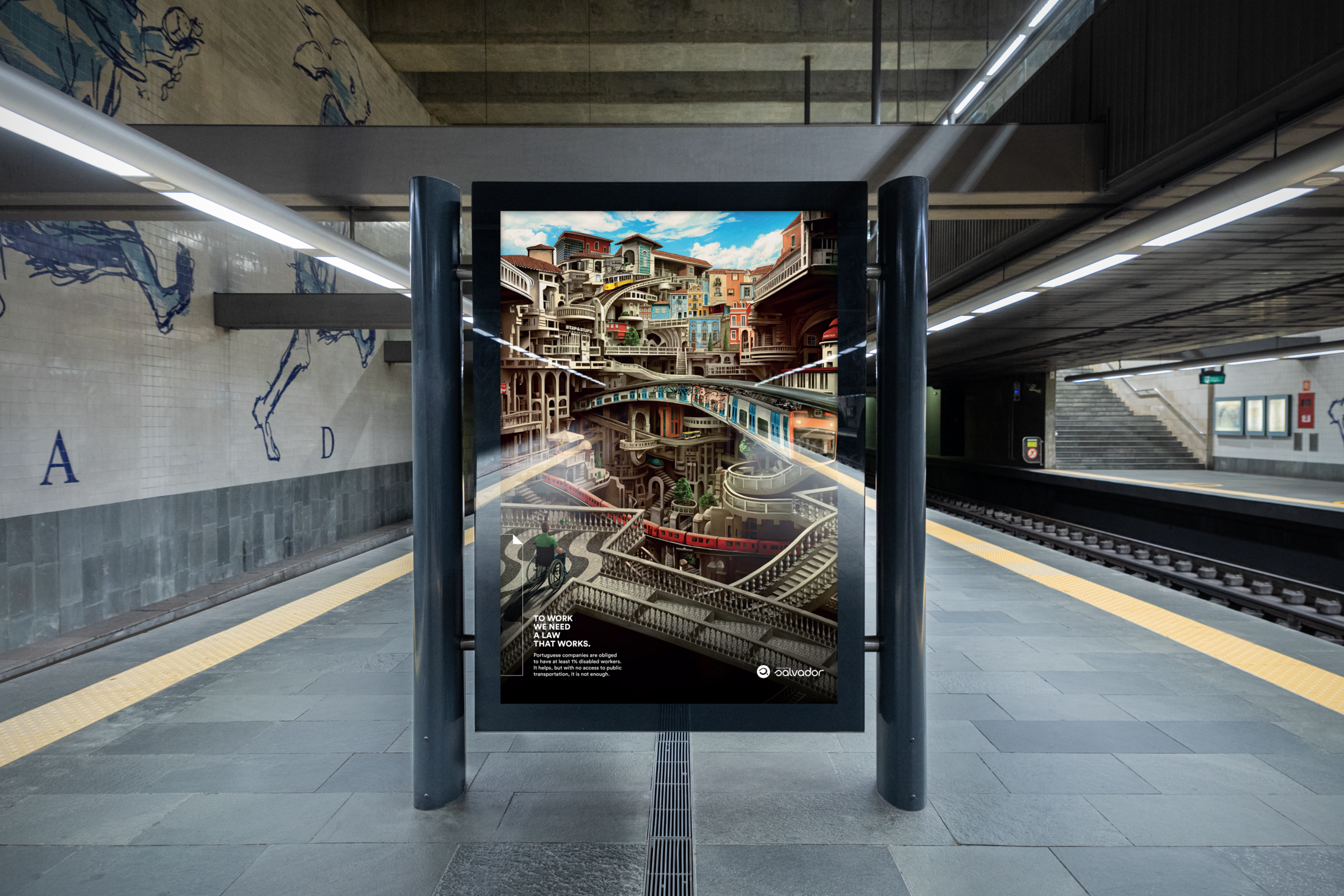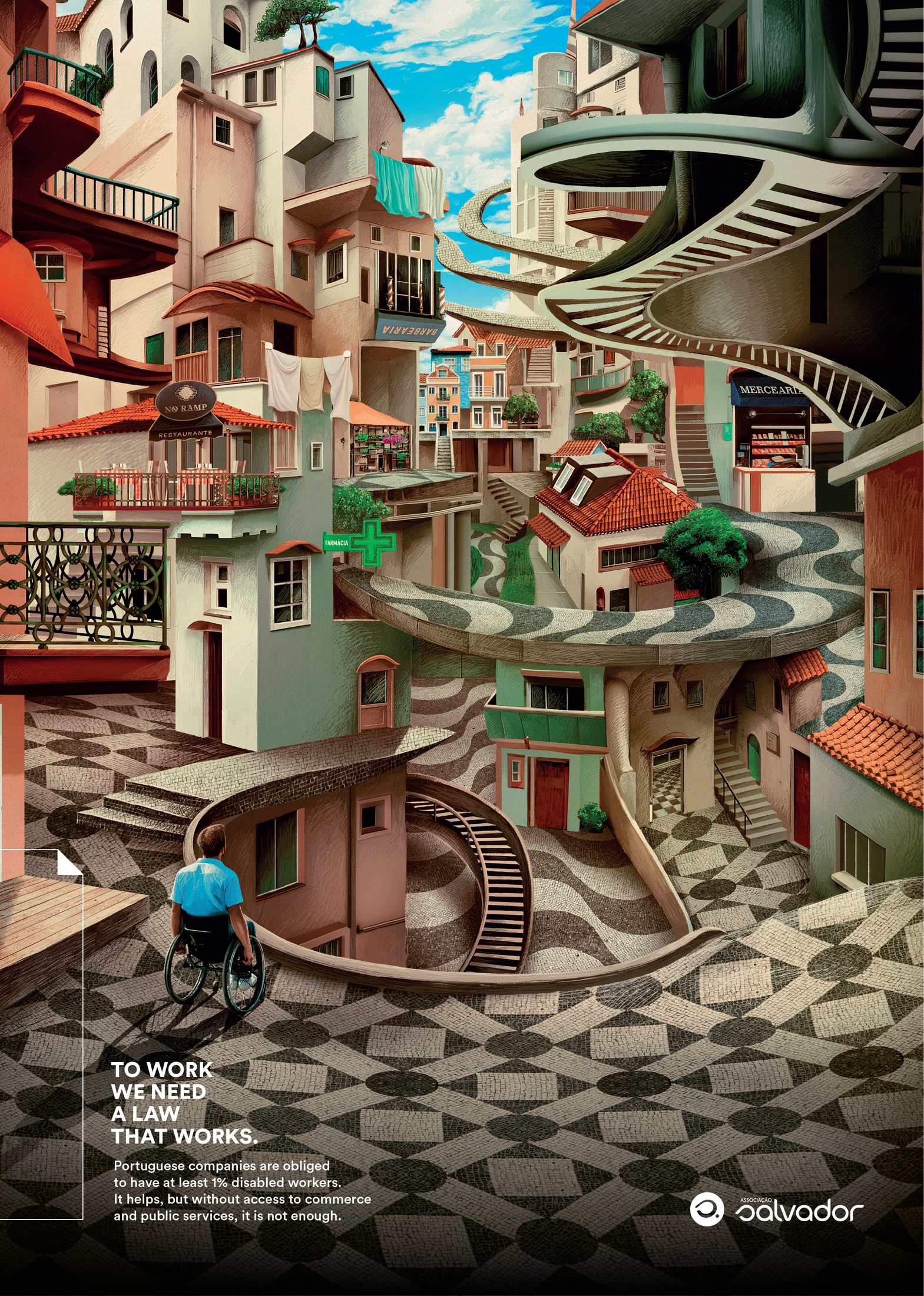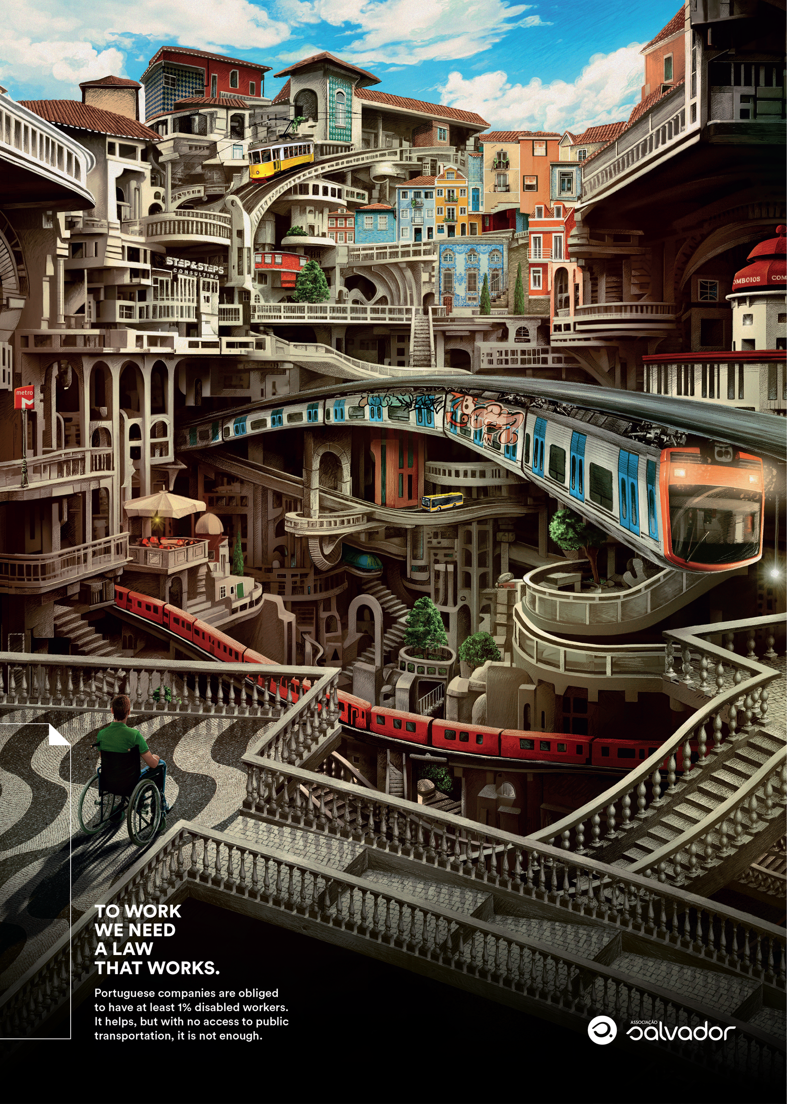 The campaign shows the impossible scenario of inaccessibility that thousands of disabled Portuguese workers face everyday when they go to work. Even if Portuguese companies are obliged by law to have at least 1% disabled workers, it helps, but with no access to public transportation, public services and commerce and even inside the workplace, it is not enough. To work, we need a law that works.