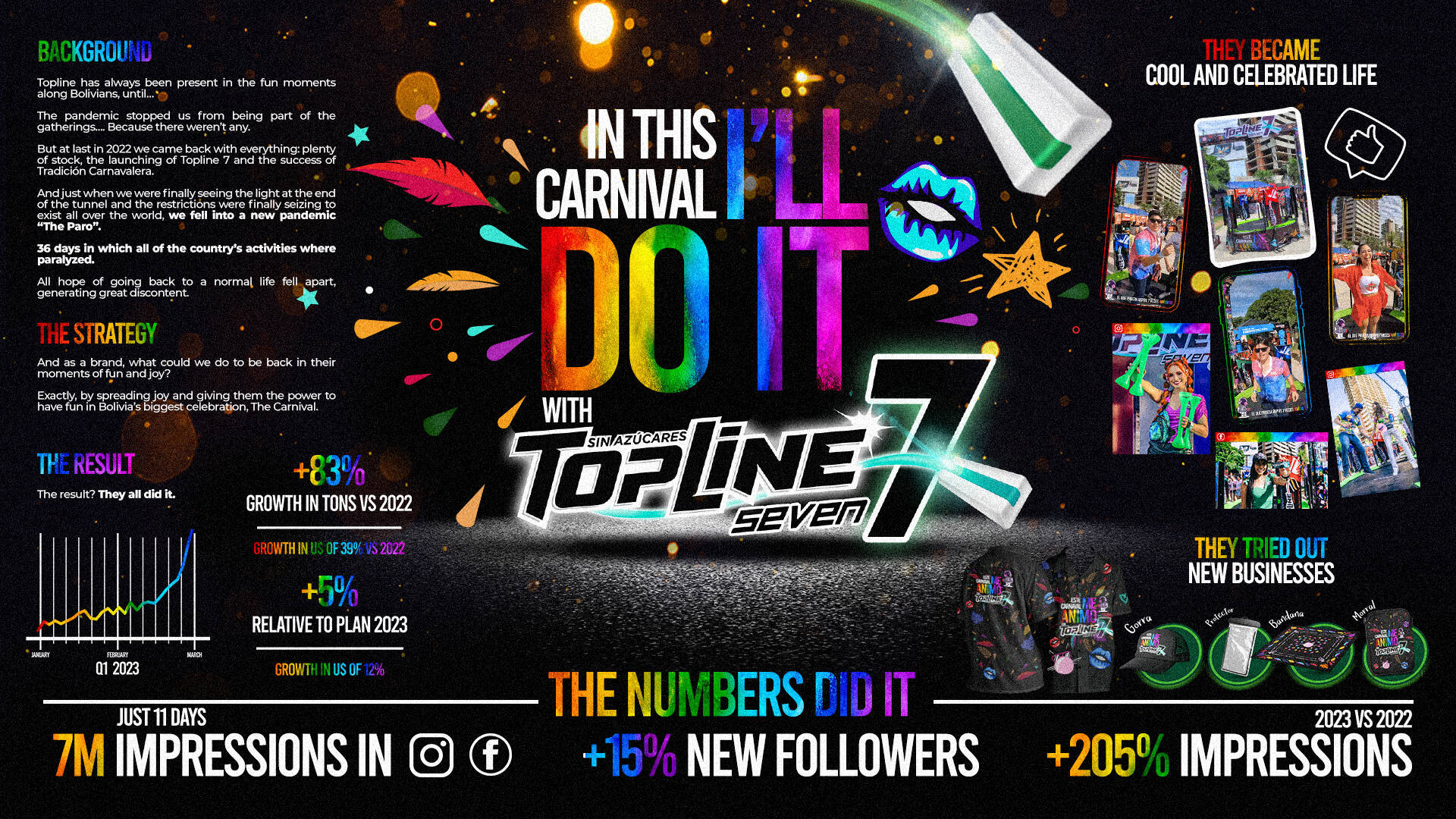 This professional campaign titled 'In this carnival i’ll do it with Topline' was published in Bolivia in February, 2023. It was created for the brands: Arcor and Topline, by ad agency: Athos. This Content, Experiential, and Static Images media campaign is related to the Confectionery, Snacks and Recreation, Leisure industries and contains 2 media assets. It was submitted over 2 years ago.