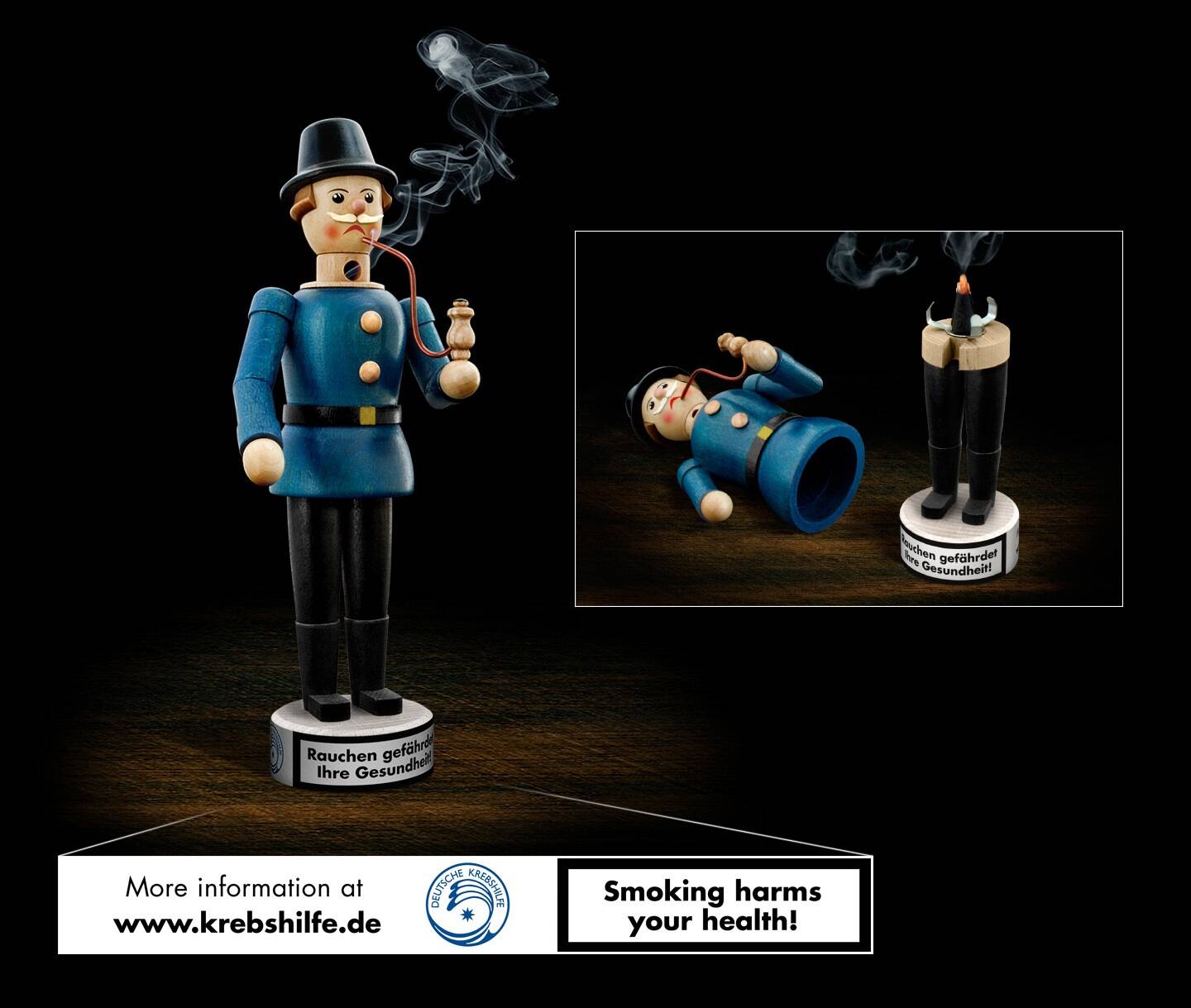 Incense smokers are traditionally placed in living rooms in Germany during Christmas time because of the good smell they spread. To create awareness about the health risks of smoking, we produced a slightly modified incense smoker as a give-away. At a closer look our incense smoker suffers from cancer of the throat because of his intense smoking.