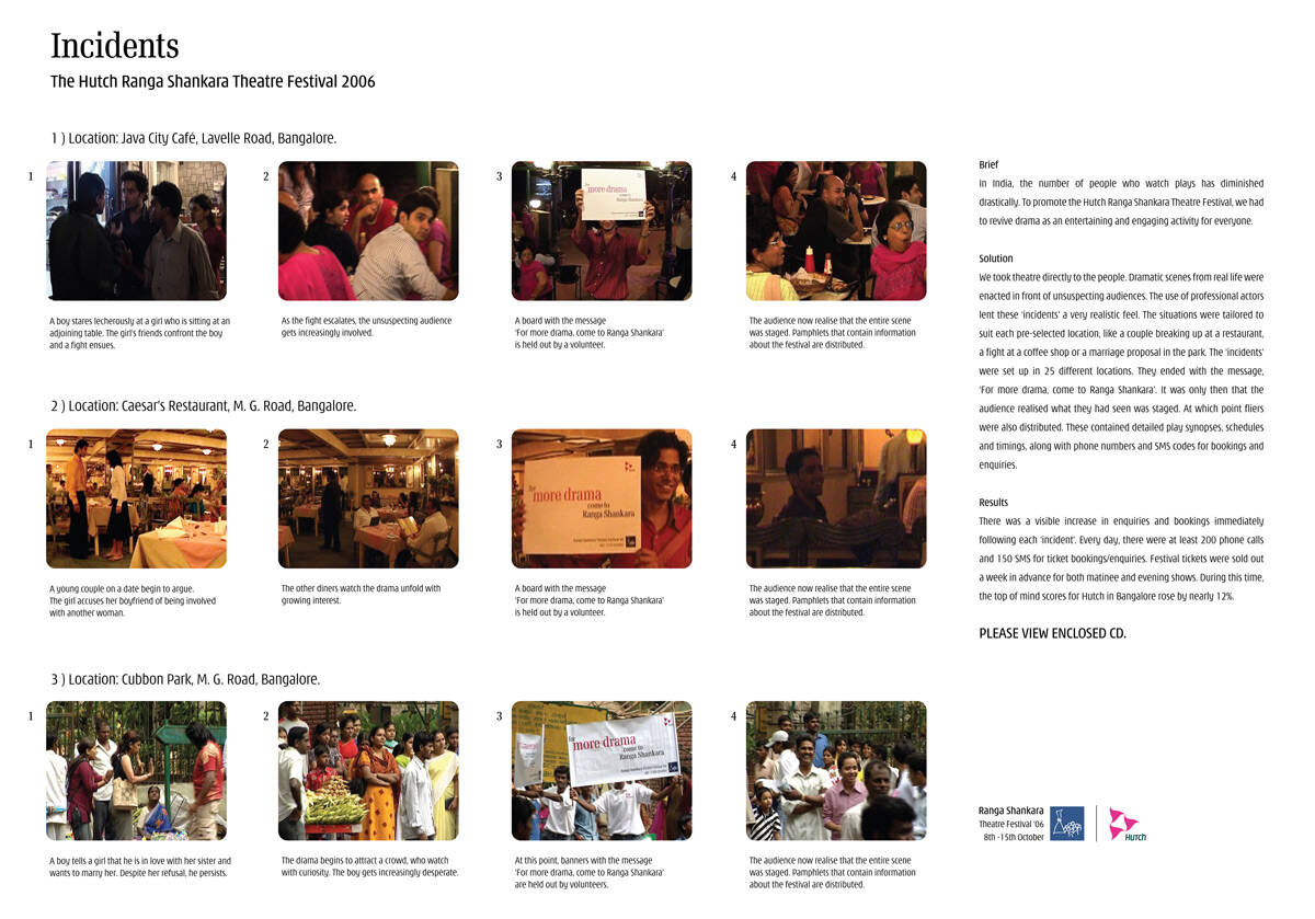Everyone loves drama, be it in cinema or real life. Based on this insight, we planted professional actors in various locations to enact scenes from real life. The audience was unaware they were staged and got completely involved in the drama. At this point, we held out boards that read, ‘For more drama, come to Ranga Shankara’ and distributed leaflets with the festival schedule. These scenes were staged in English and Kannada at 25 different locations and were captured on hidden camera. They were successful in generating interest and all the shows were sold out a week in advance.