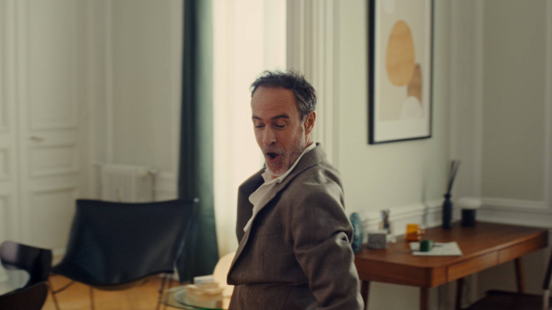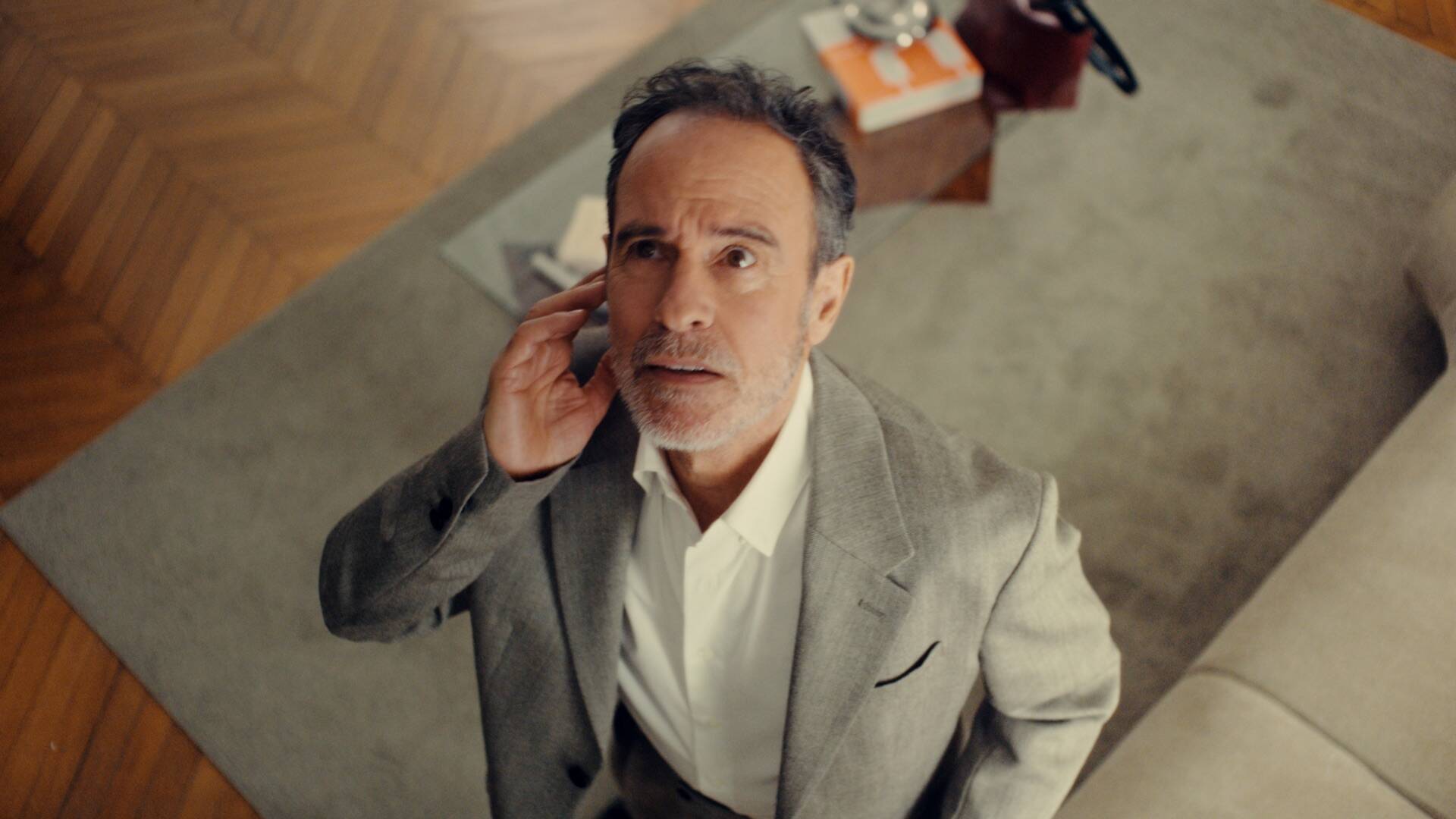 A stylish gentleman inserts a virtually invisible hearing aid and proceeds to dance around his apartment to the beat of popular French 80s track, “De bonne humeur ce matin” (A good mood in the morning) by Tristan.