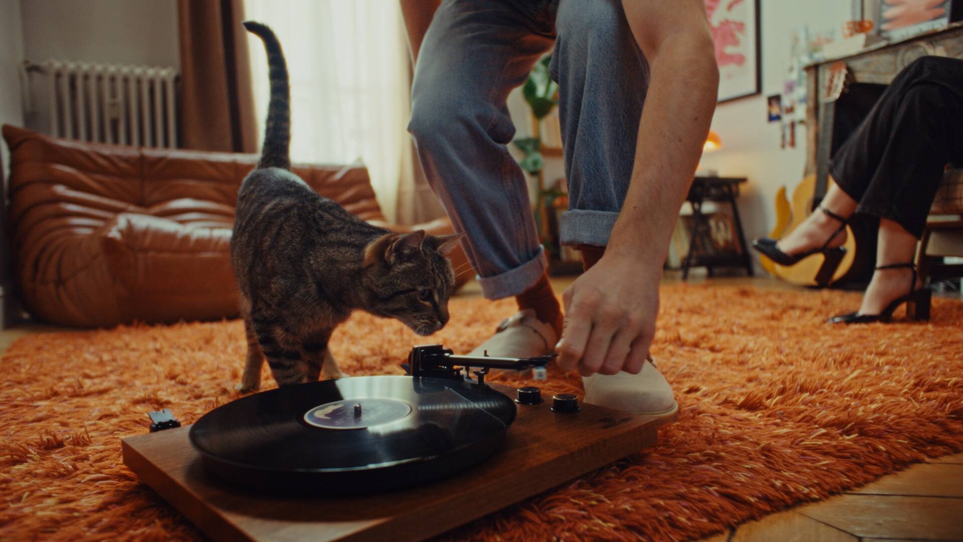 When the music cuts unexpectedly, he bangs on his ceiling in disappointment, revealing that the music was coming from his upstairs neighbour all along.