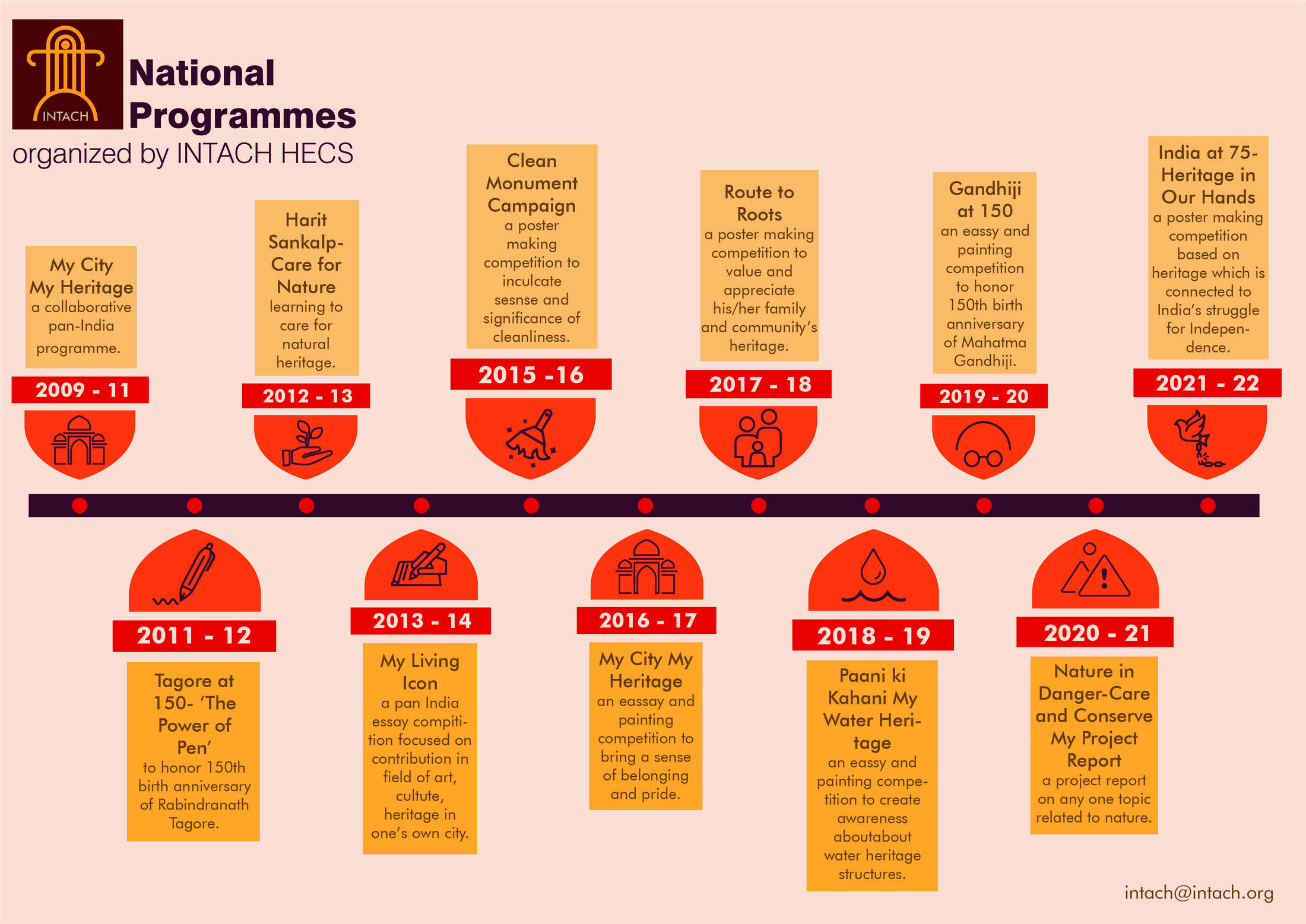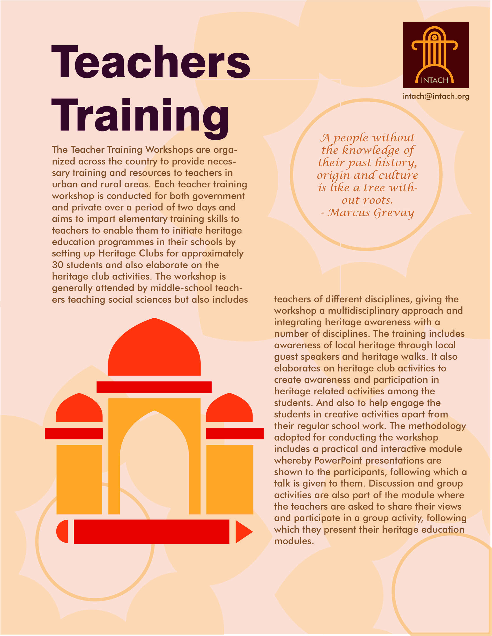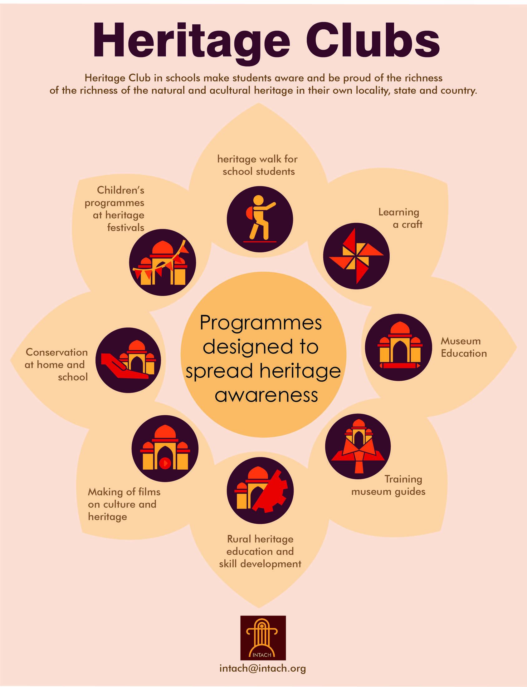 The Indian National Trust for Art and Cultural Heritage (INTACH) is a non-profit charitable organization. Among the tasks undertaken by INTACH are restoration of monuments and their management; advocacy for heritage property conservation; public awareness through heritage walks and buses; establishment of heritage clubs in schools; and holding of awareness workshop for teachers of schools and colleges and heritage walks to various unprotected sites.