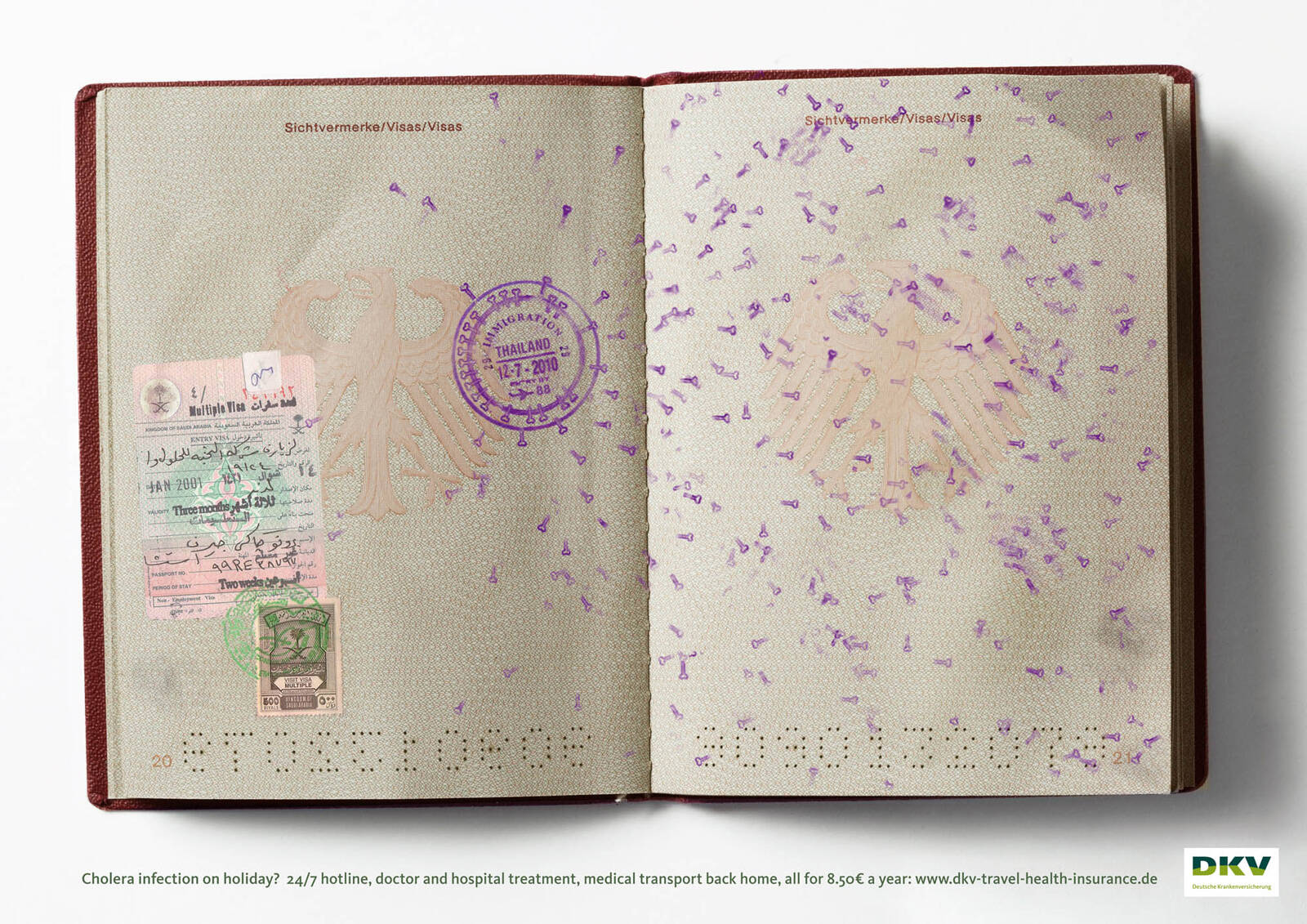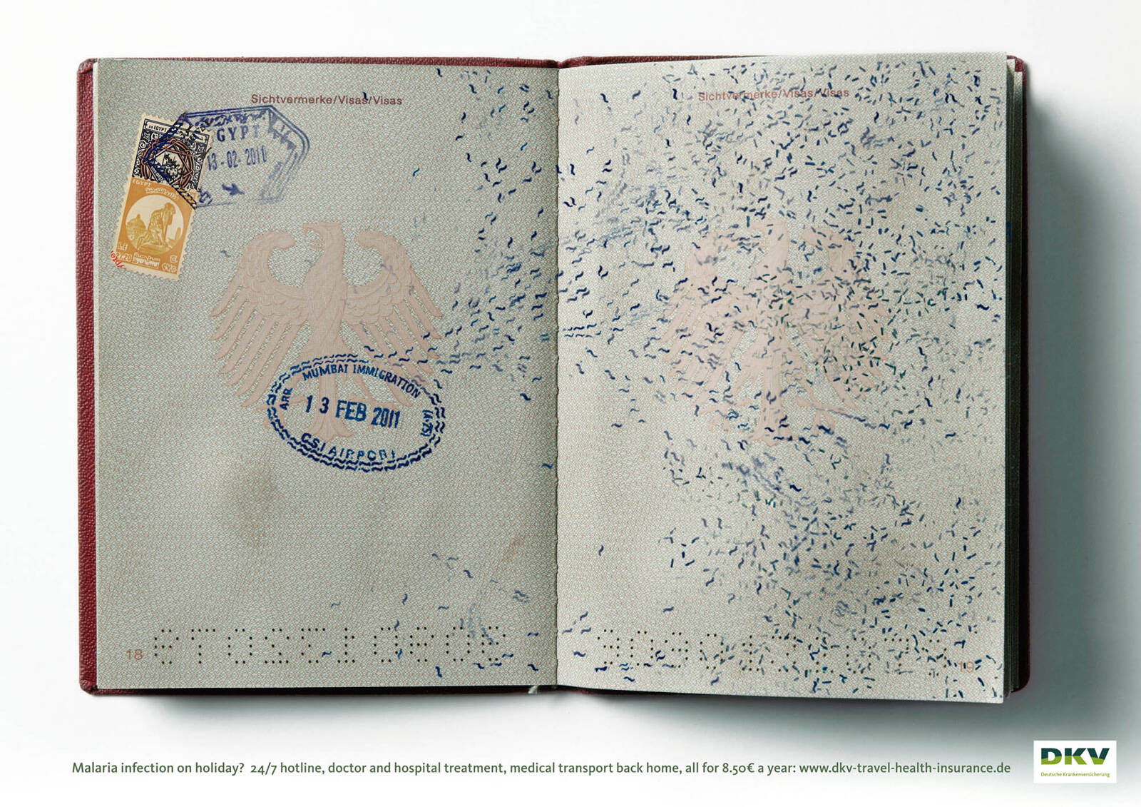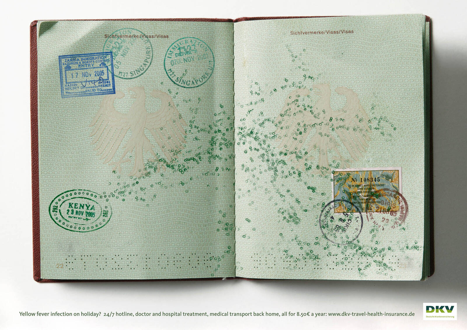 This professional campaign titled 'Infectious Passports, Malaria, Infectious Passports, Yell...' was published in Germany in June, 2011. It was created for the brand: DKV, by ad agency: Ogilvy. This Print medium campaign is related to the Finance industry and contains 3 media assets. It was submitted over 14 years ago.