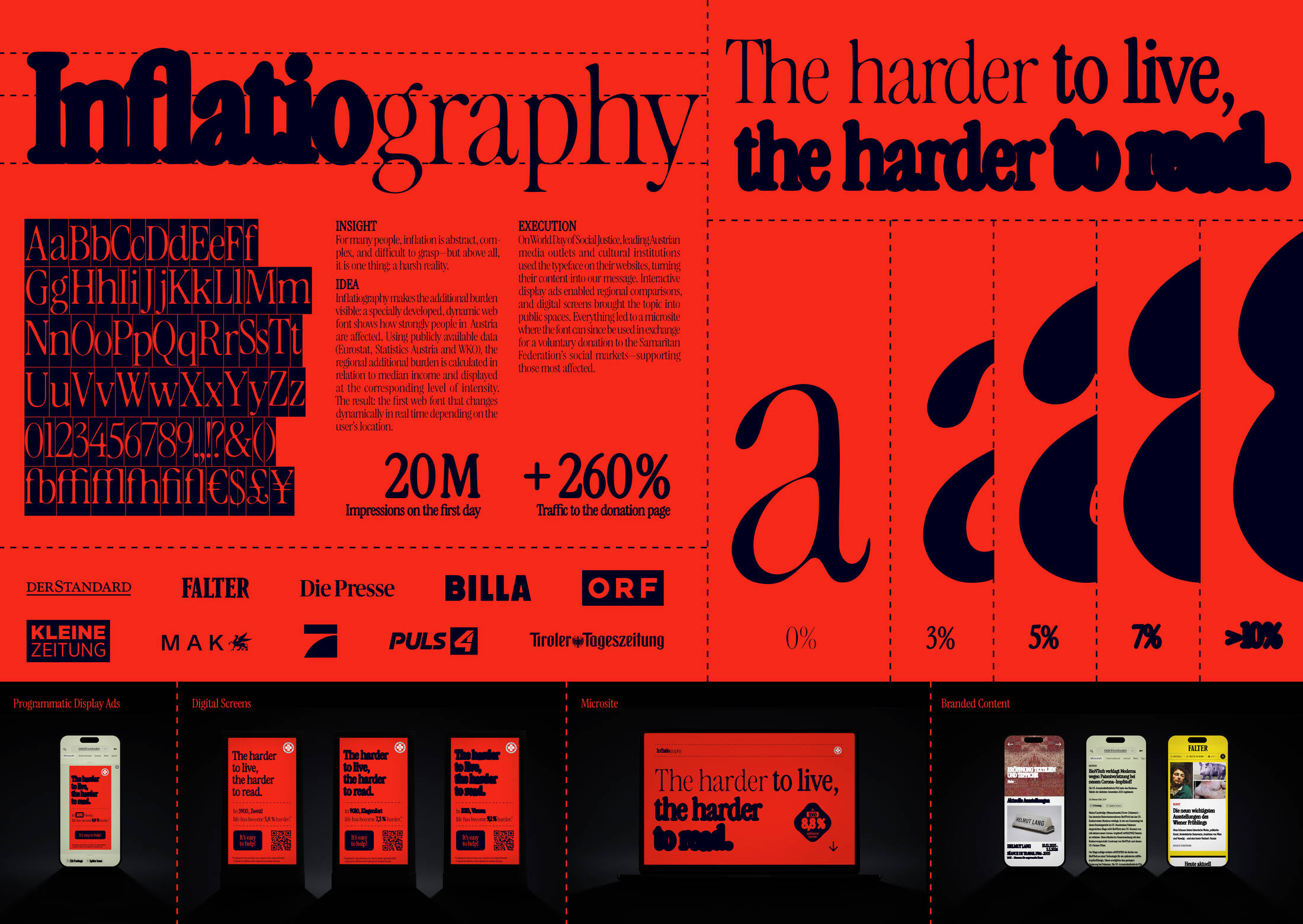 Following the idea “the harder to live, the harder to read,” the Samariterbund developed INFLATIOGRAPHY: the first web font that dynamically changes in real time based on users’ location. Using publicly available data from Eurostat, Statistik Austria, and the Austrian Economic Chamber (WKO), the regional financial burden relative to median income was calculated and reflected in the font’s level of “heaviness.”