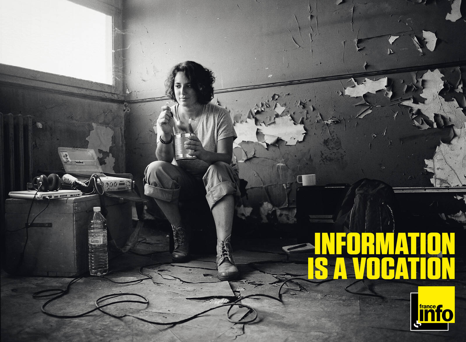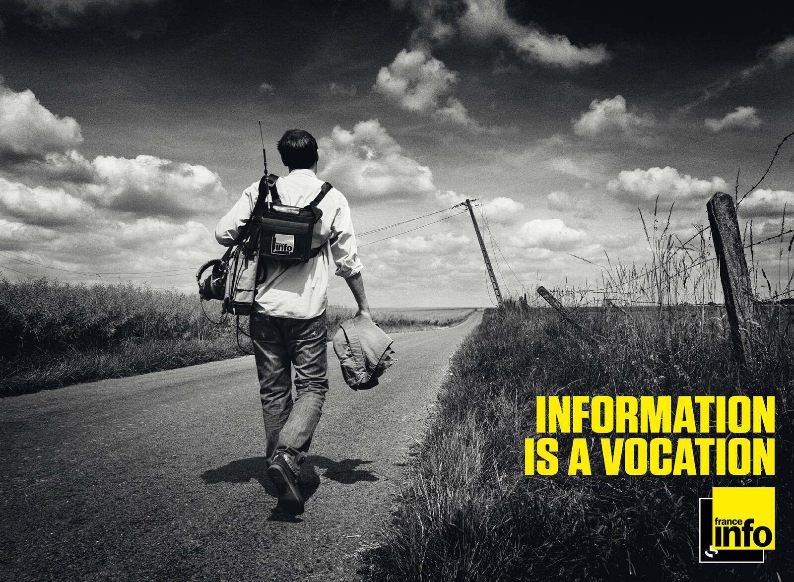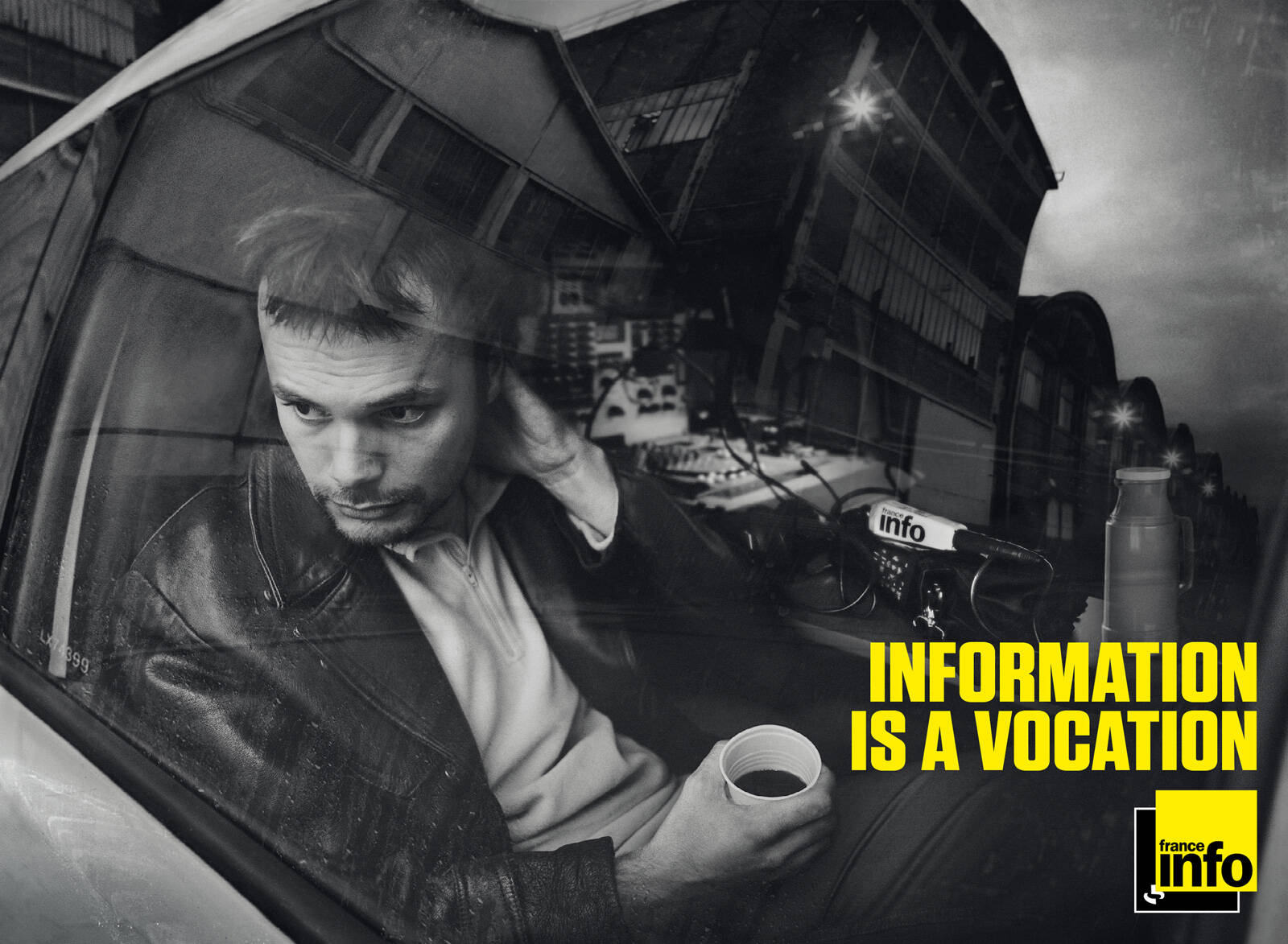Euro RSCG C&O created an advertising campaign for the first French information radio, France Info. The campaign includes a series of 3 black and white posters and magazine adverts (photographer: Marc Gouby). Three people of the editorial staff have been shot to empower the idea that reporters are at the heart of information.
