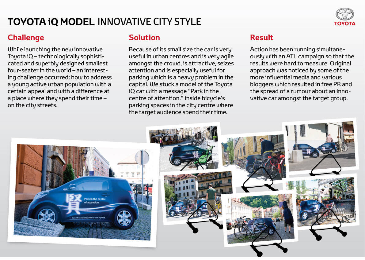 This professional campaign titled 'Innovative city style' was published in Slovenia in May, 2009. It was created for the brand: Toyota, by ad agency: Saatchi & Saatchi. This Ambient medium campaign is related to the Automotive and Personal Transportation industry and contains 1 media asset. It was submitted over 16 years ago.