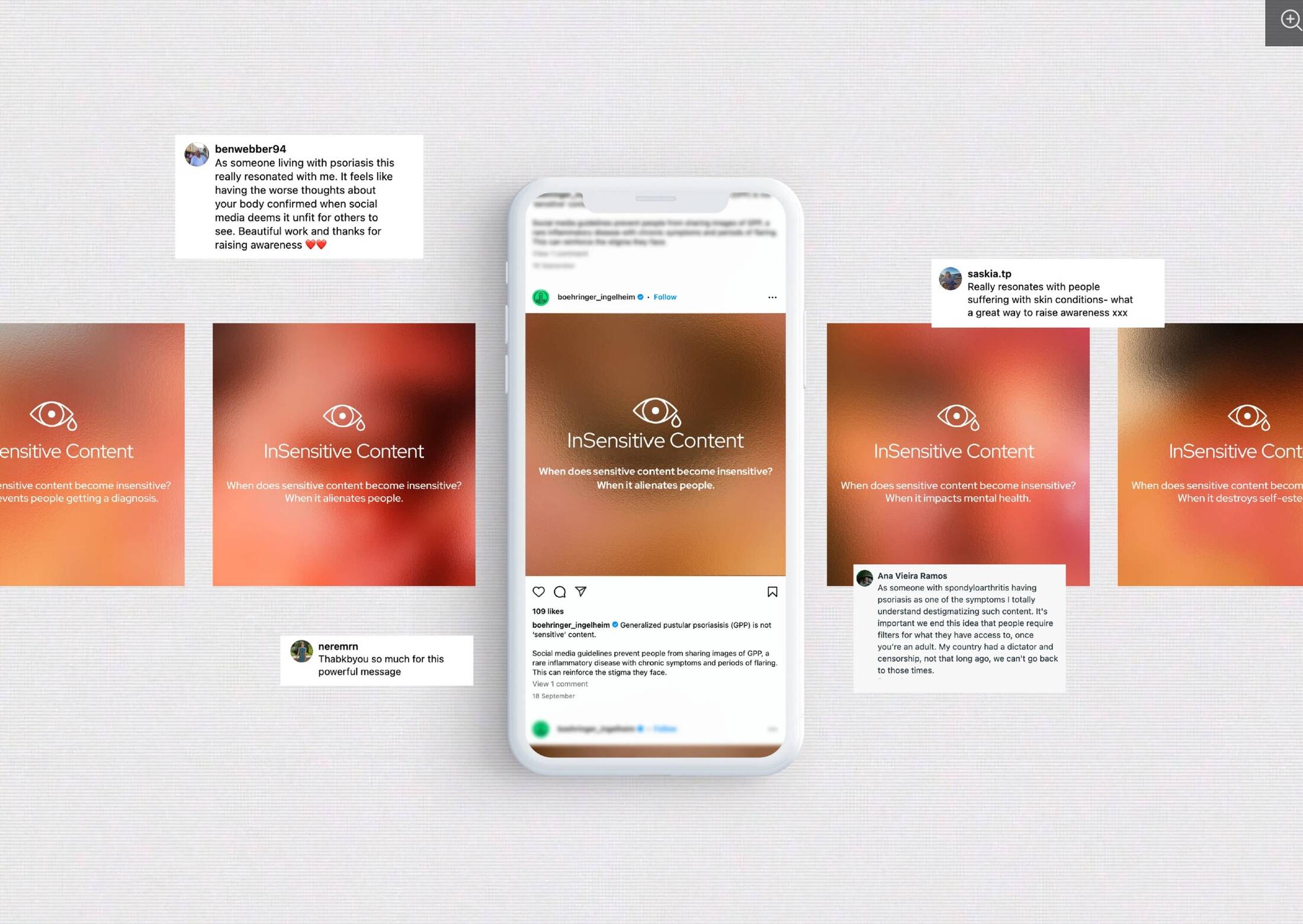 Going further than that, it also reinforces stigma that GPP and other skin conditions are something to be ashamed of and hidden. We created InSensitive Content, a campaign showing how the guidelines that are in place to protect some people, are hurting others. Our work amplified the impact that content blockers have on people with GPP, in the way that social media forces them to be seen.