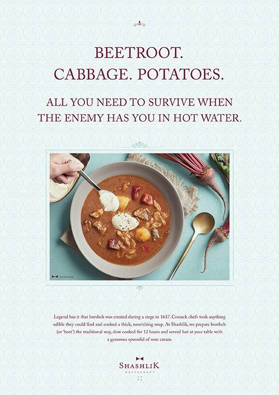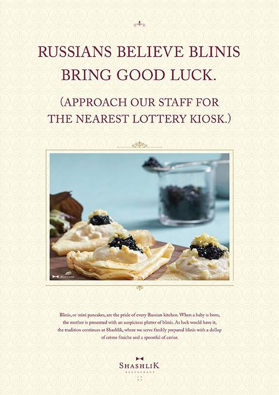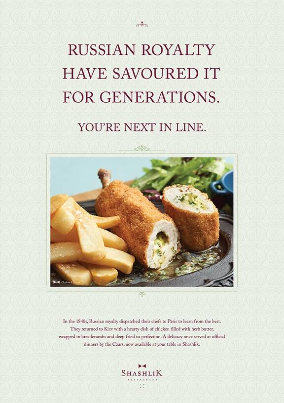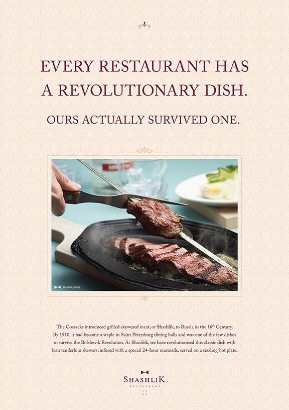 This professional campaign titled 'Inspiration' was published in Singapore in May, 2019. It was created for the brand: Shashlik Restaurant, by ad agency: Blak Labs. This Print medium campaign is related to the Food industry and contains 6 media assets. It was submitted over 6 years ago.