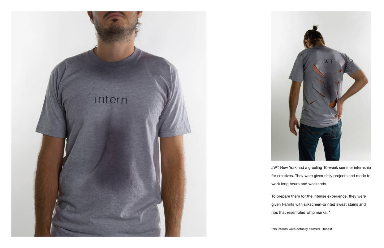 This professional campaign titled 'Intern shirts' was published in United States in May, 2007. It was created for the brand: JWT, by ad agency: JWT. This Static Images medium campaign is related to the Agency Self-Promo industry and contains 1 media asset. It was submitted over 16 years ago.