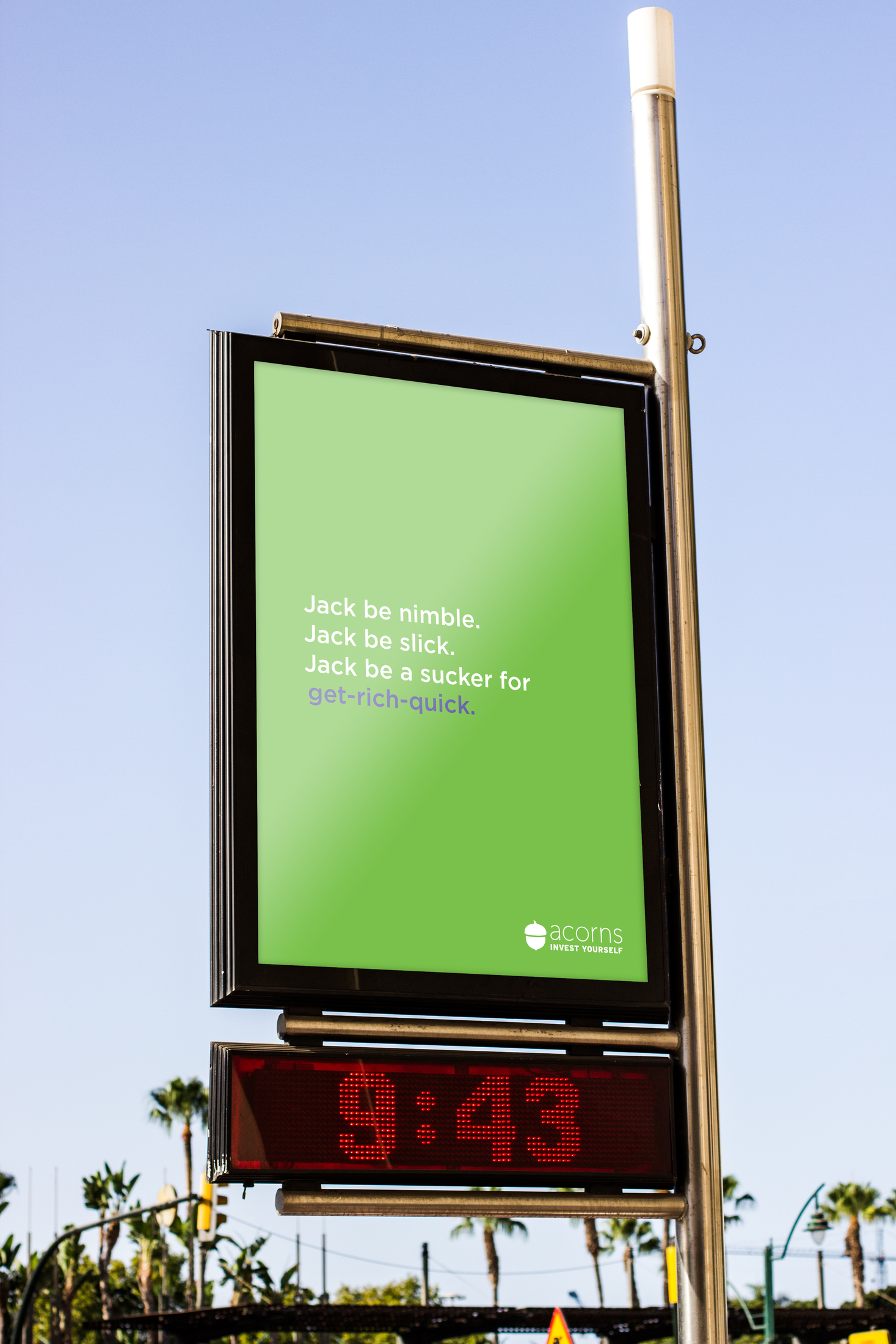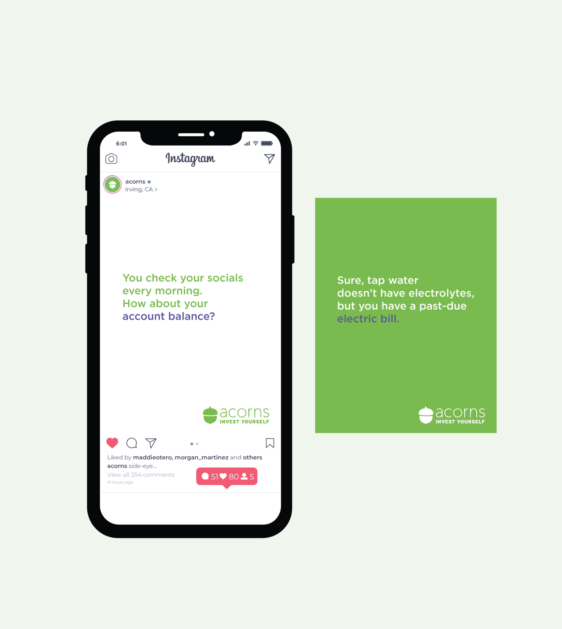Young adults aren’t particularly renowned for their ability to save. Acorns is an app that teaches financial literacy by investing spare change so users earn and learn. Acorns sets users up for success from an early age, so we wanted to create a campaign that tonally appealed to young adults.