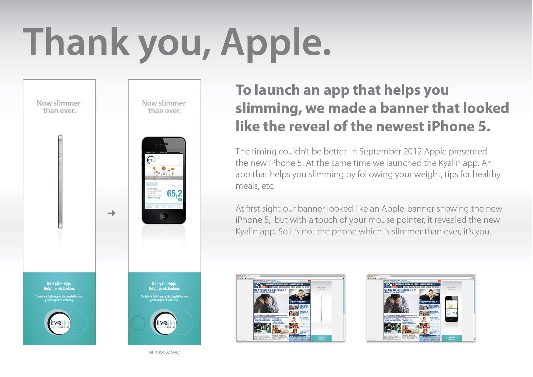 This professional campaign titled 'iPhone 5' was published in Belgium in September, 2012. It was created for the brand: Kyalin, by ad agency: 10 Advertising. This Digital medium campaign is related to the Health industry and contains 1 media asset. It was submitted about 13 years ago.