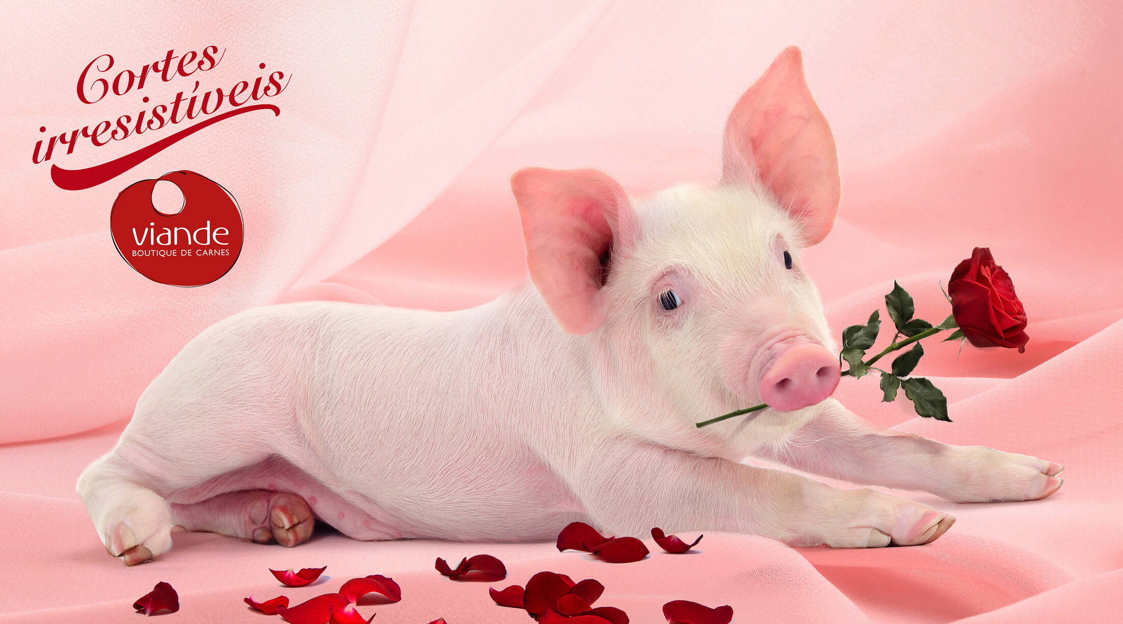 The little white pig with a red rose in its mouth surrounded by red petals on a silky pink background creates a very attractive atmosphere and turns the animal into an irresistible character. It's so cute you want to bite it.