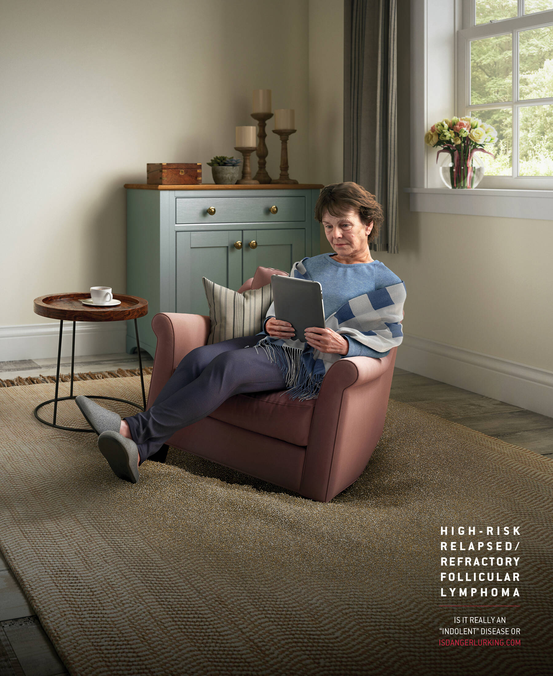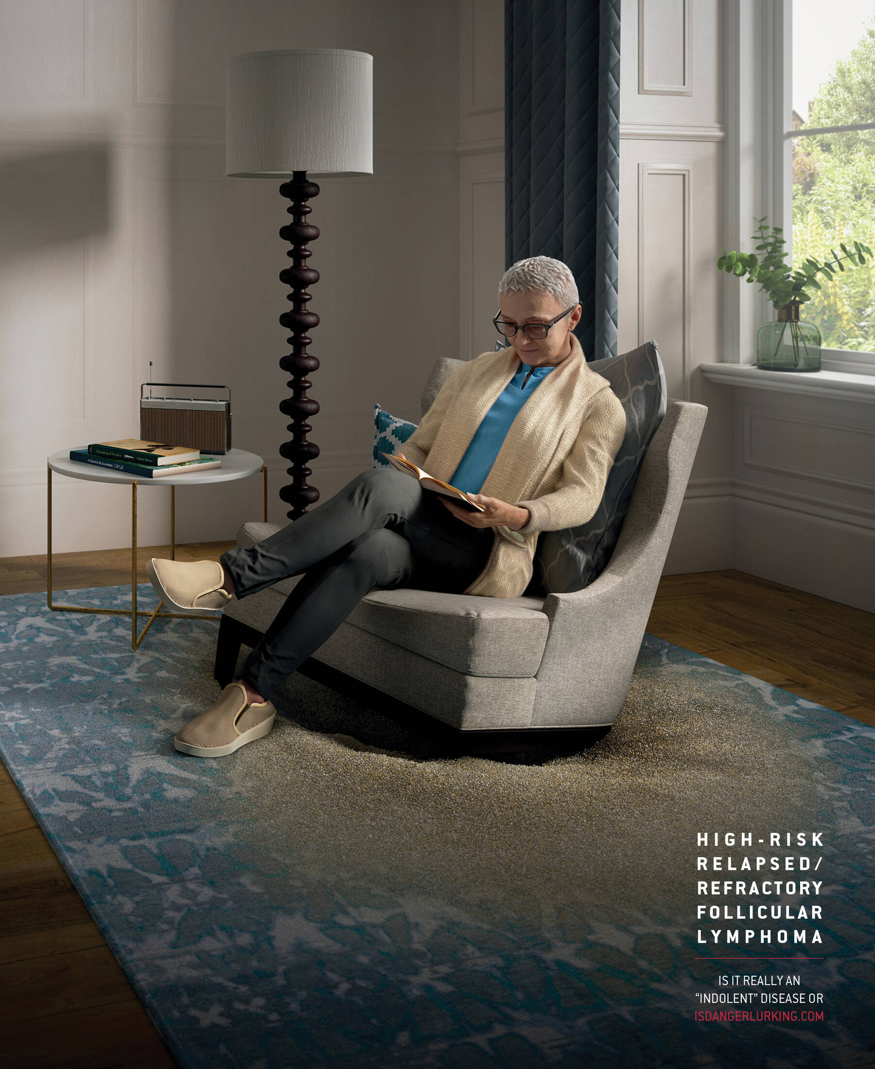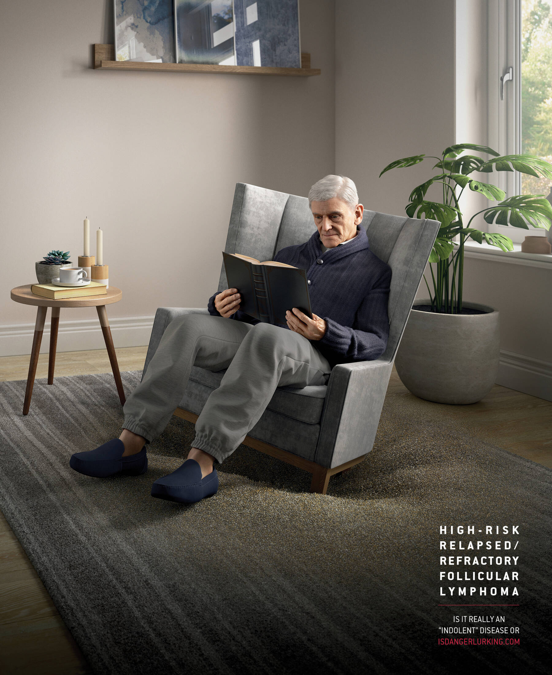 of treatment—making it critical to identify them as early as possible. However, this is not a set of patients that doctors think to look for. Enter: The Danger Lurking campaign. A completely computer-generated campaign, this initiative features patients calmly living their lives, sitting in chairs sinking in quicksand. They don’t know the danger they’re in because they’ve been reassured by their doctors that they’re out of danger. Arresting and quick, the sinking chairs highlight the patients who can get dangerously overlooked. In addition, every pixel was created by computer, due to the necessity of avoiding any photoshoots during the pandemic. No stock photography was used; every wrinkle and slipper were designed.