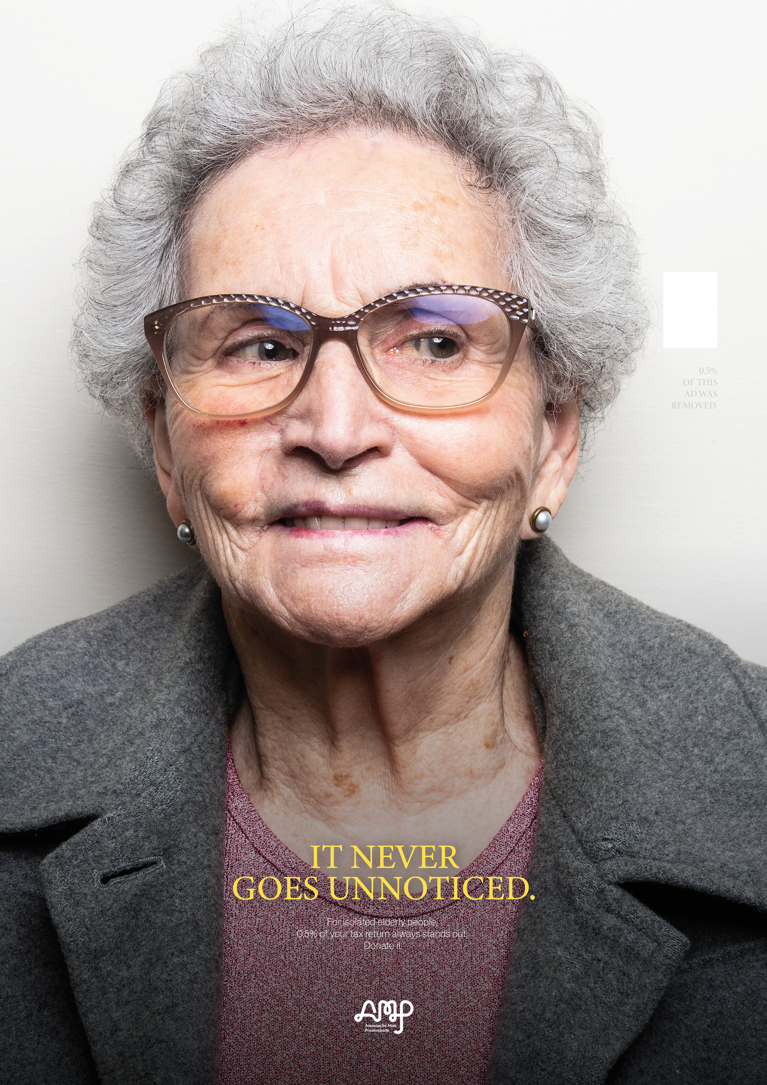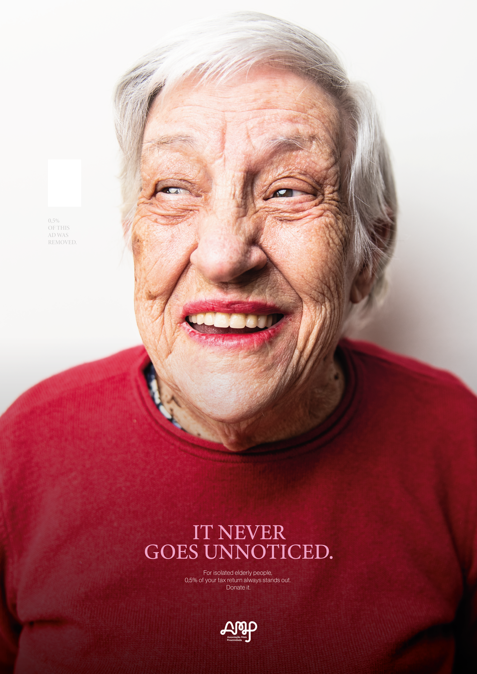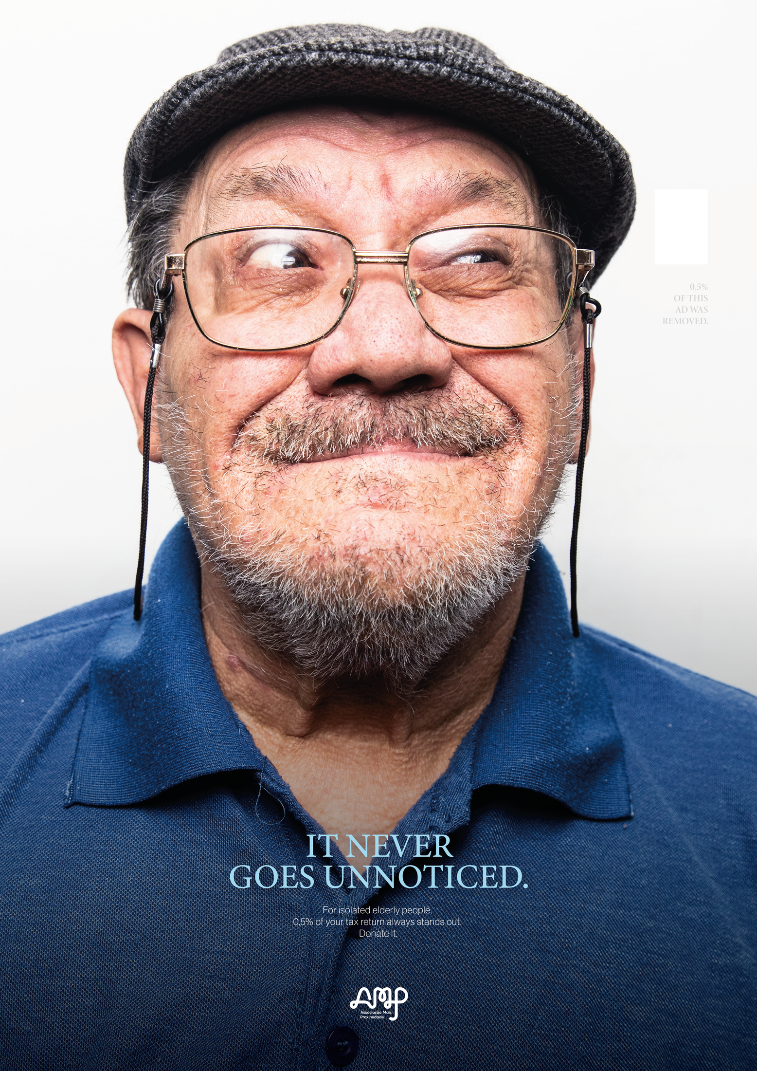 A campaign that aims to subvert people’s perception by literally removing the 0,5% of tax return donation from all their pieces. A simple, funny, and ironic way that makes them look and think twice about this unnoticed theme.