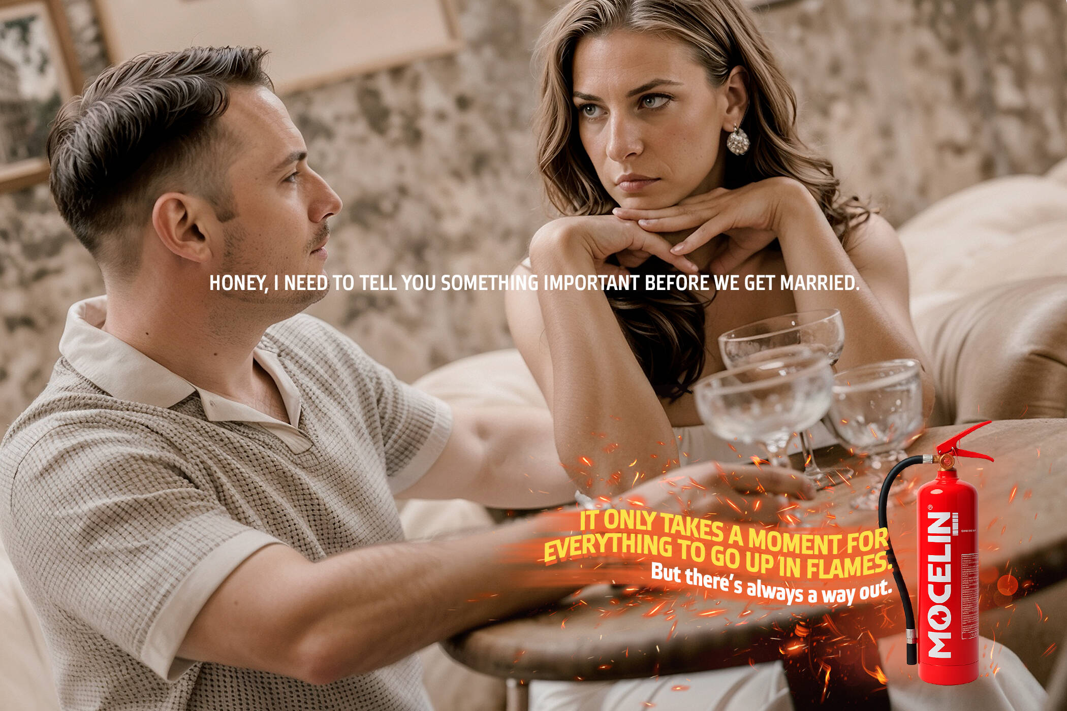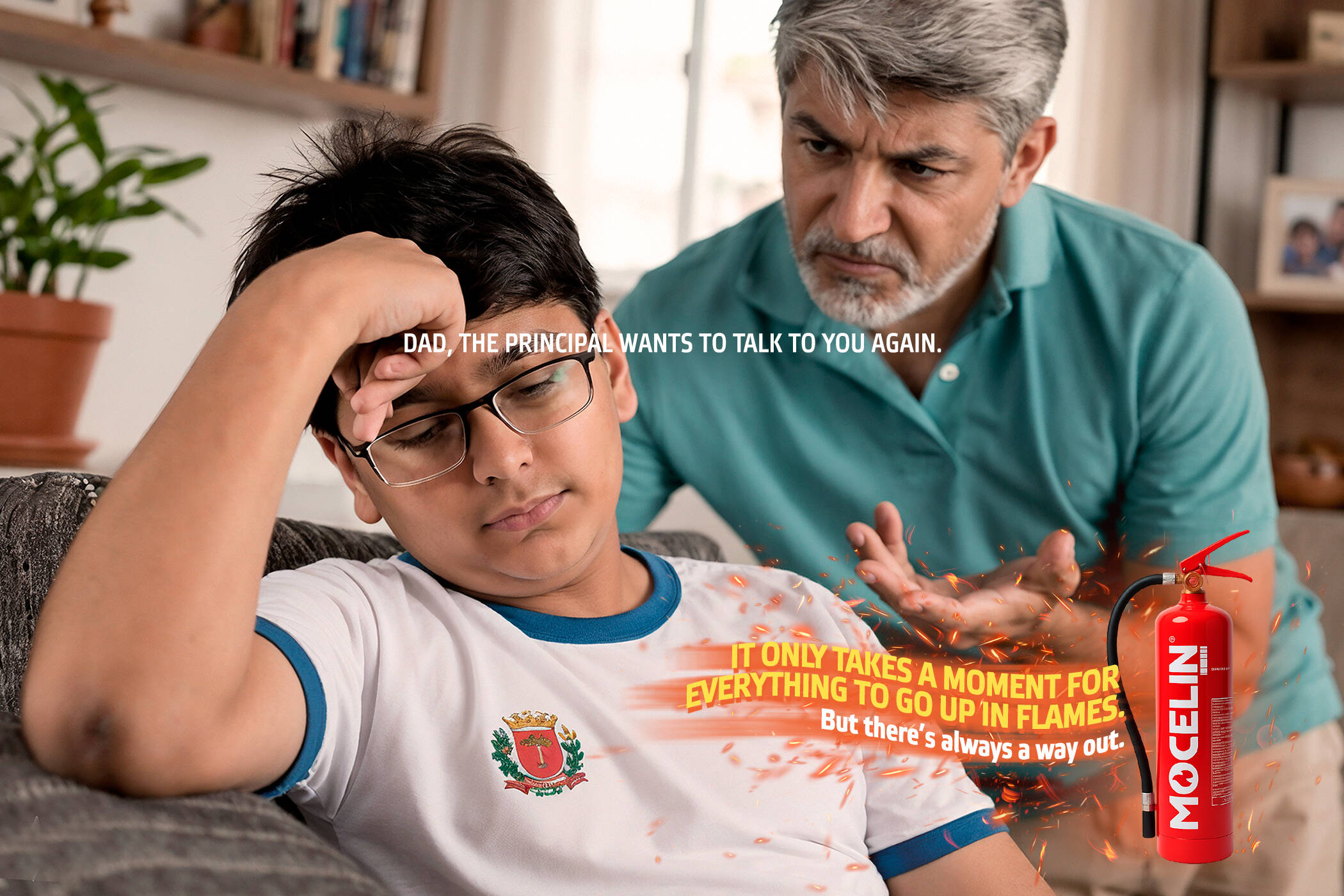 A fire can start in seconds. Built on this simple truth, Mocelin created a print campaign drawing a parallel between a phrase that sparks conflict and a real fire—showing that in both cases, acting in time changes everything.