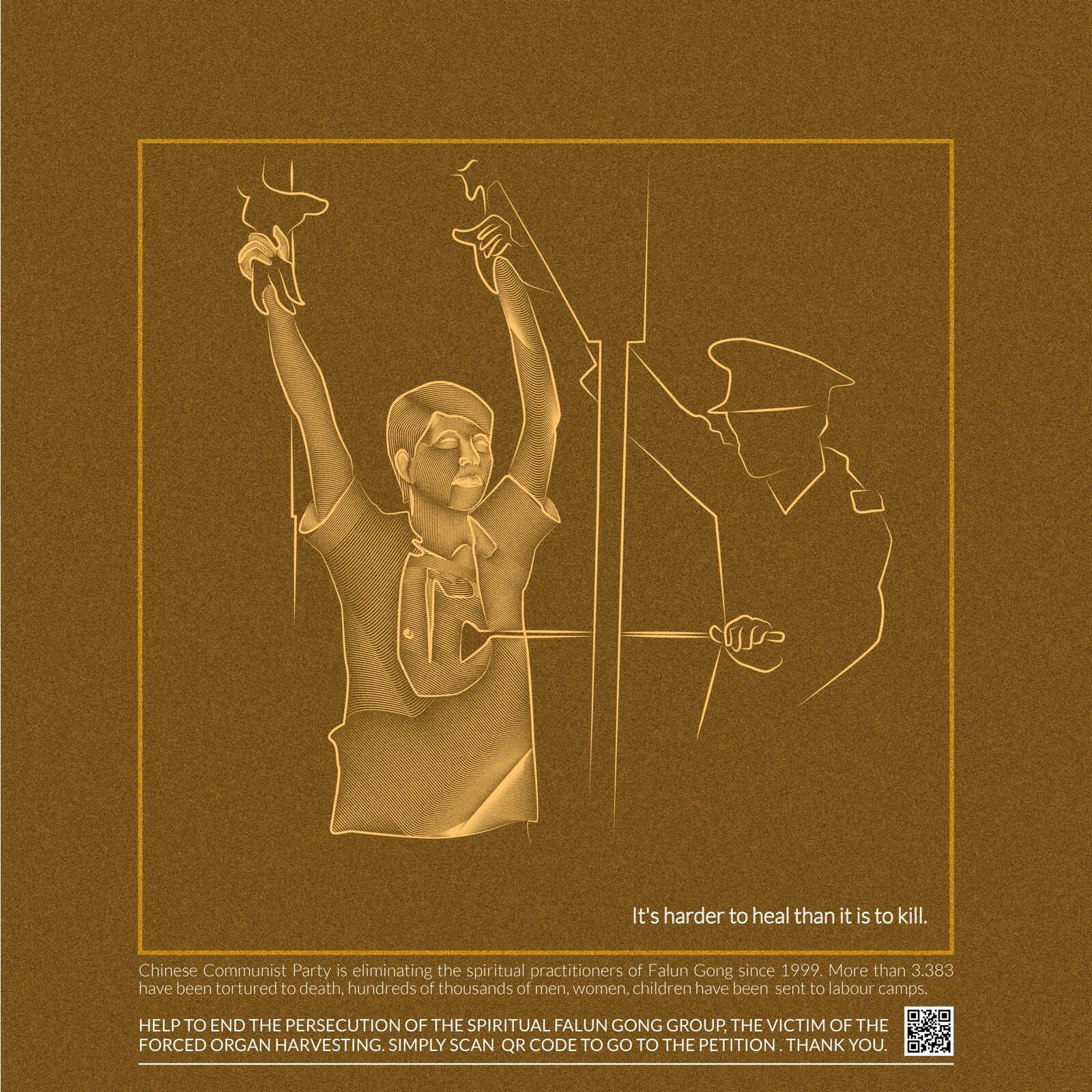 Chinese Communist Party is eliminating the spiritual practitioners of Falun Gong since 1999. More than 3.383 have been tortured to death, hundreds of thousands of men, women, children have been sent to labour camps. It is easier to accept illustration than real photo when it comes to torture and real people suffer. Illustration posters create an awareness about methods of torture and calls for the act to help Falun Gong practitioners - victim of forced organ harvesting to stop the persecution by simply scan QR code and sign the petition.
