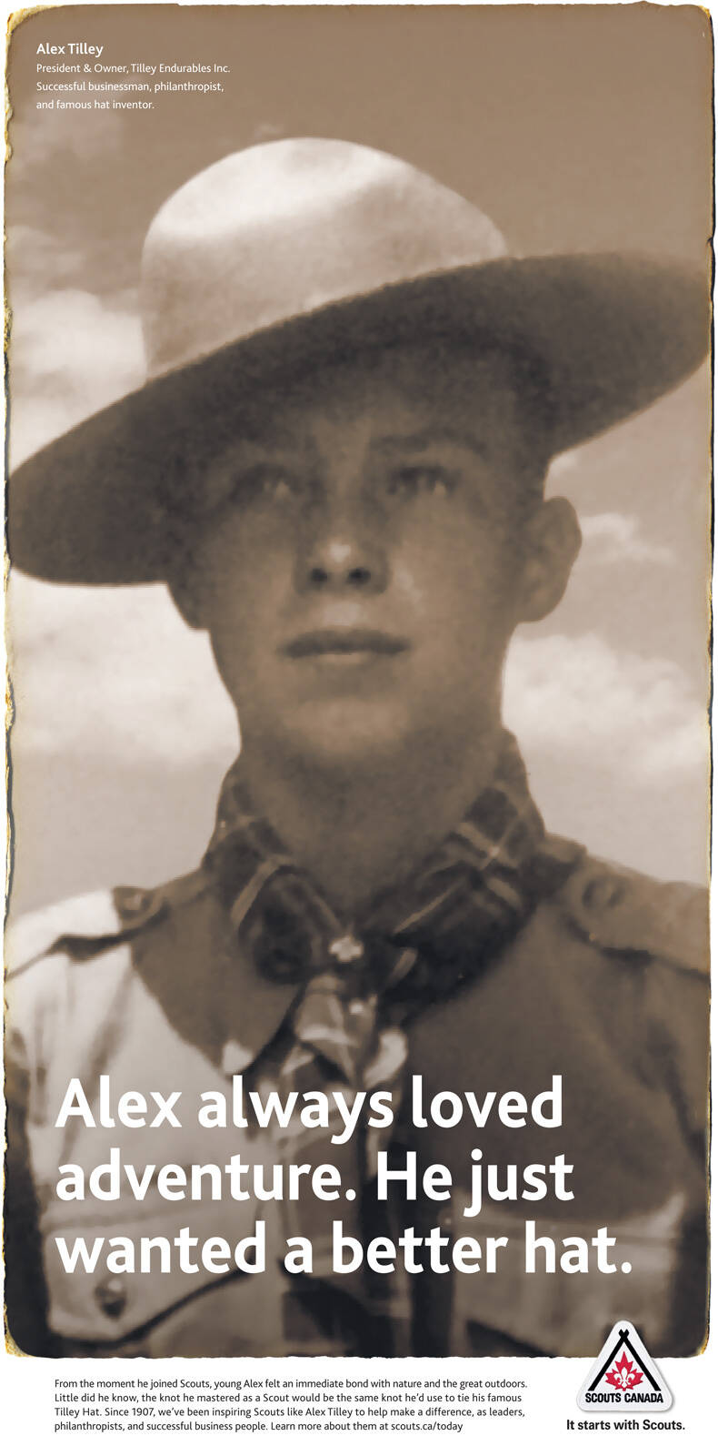 This professional campaign titled 'It Starts with Scouts, Alex Tilley' was published in Canada in March, 2011. It was created for the brand: Boy Scouts, by ad agency: Target. This Print medium campaign is related to the Professional Services industry and contains 1 media asset. It was submitted over 14 years ago.