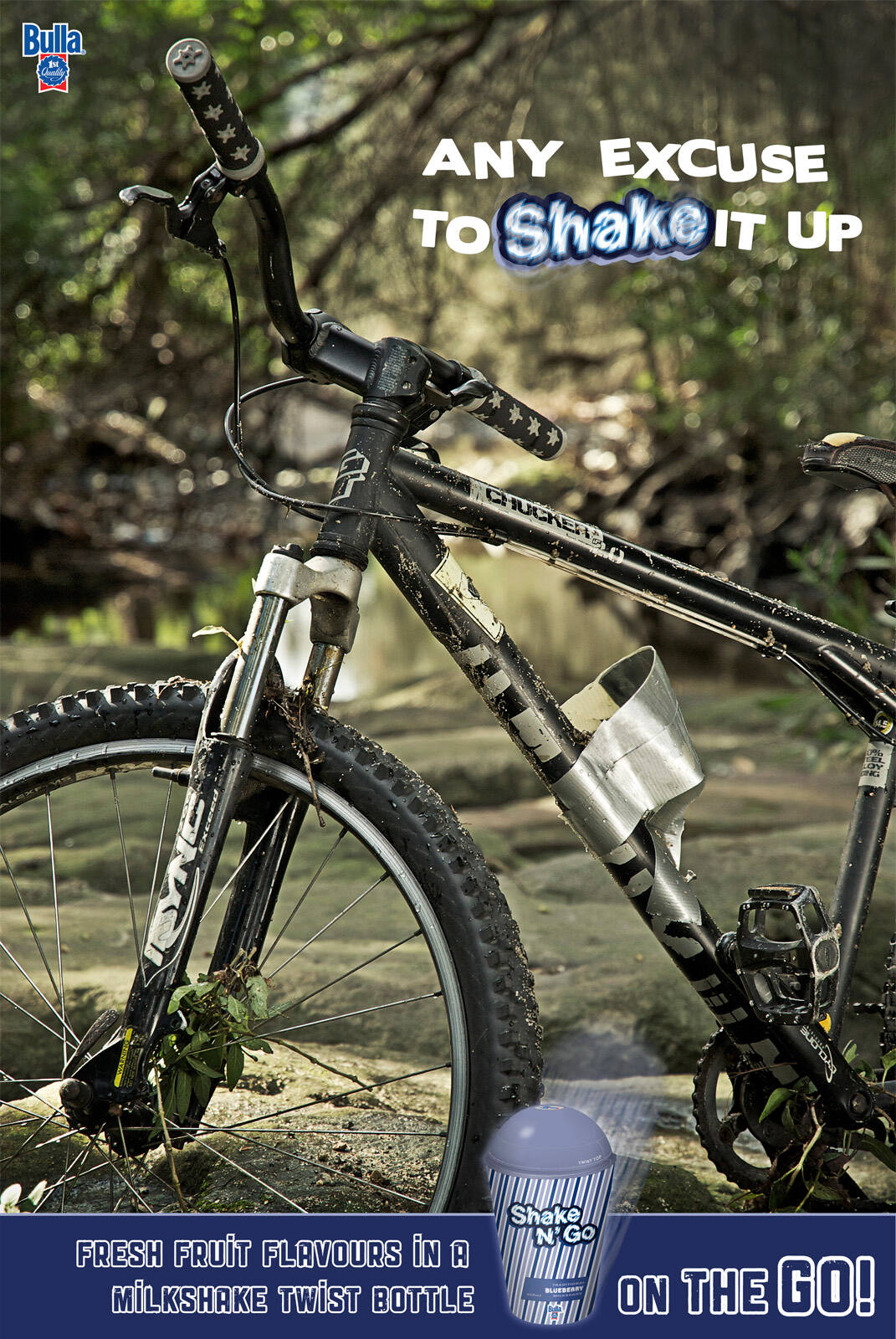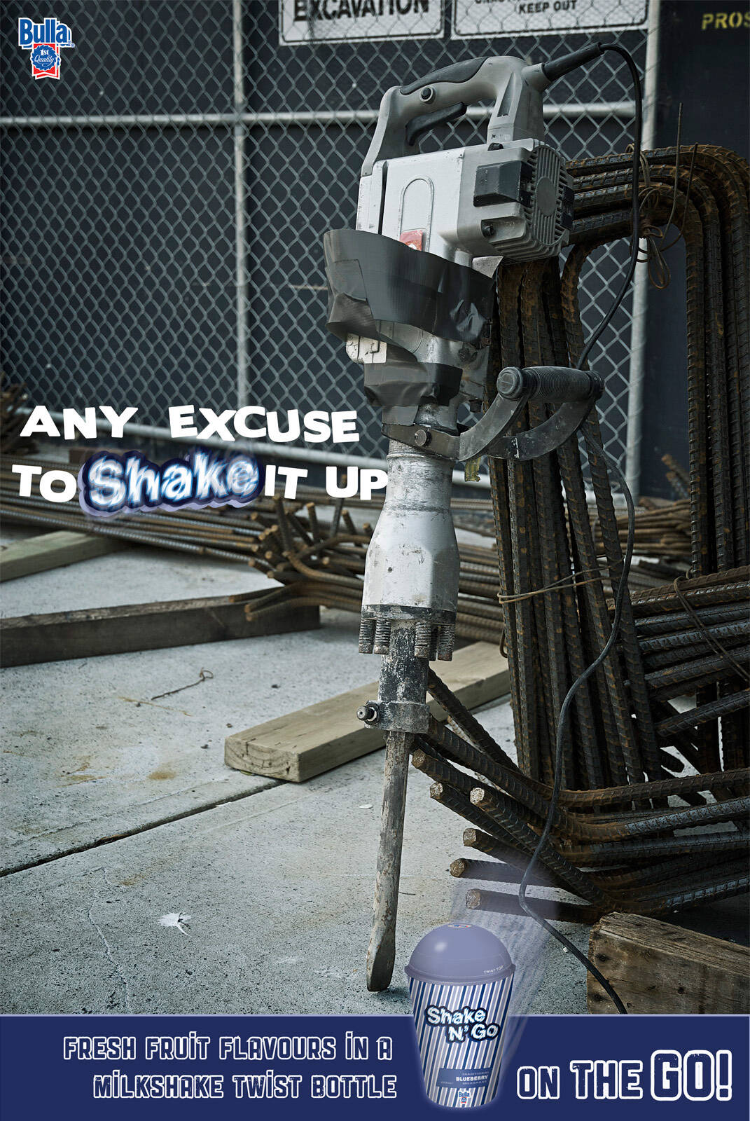 This professional campaign titled 'Jackhammer, Mountain bike' was published in Australia in May, 2016. It was created for the brand: Shake N' Go, by ad agency: Billy Blue. This Print medium campaign is related to the Drinks (Non Alcoholic) industry and contains 2 media assets. It was submitted almost 15 years ago.