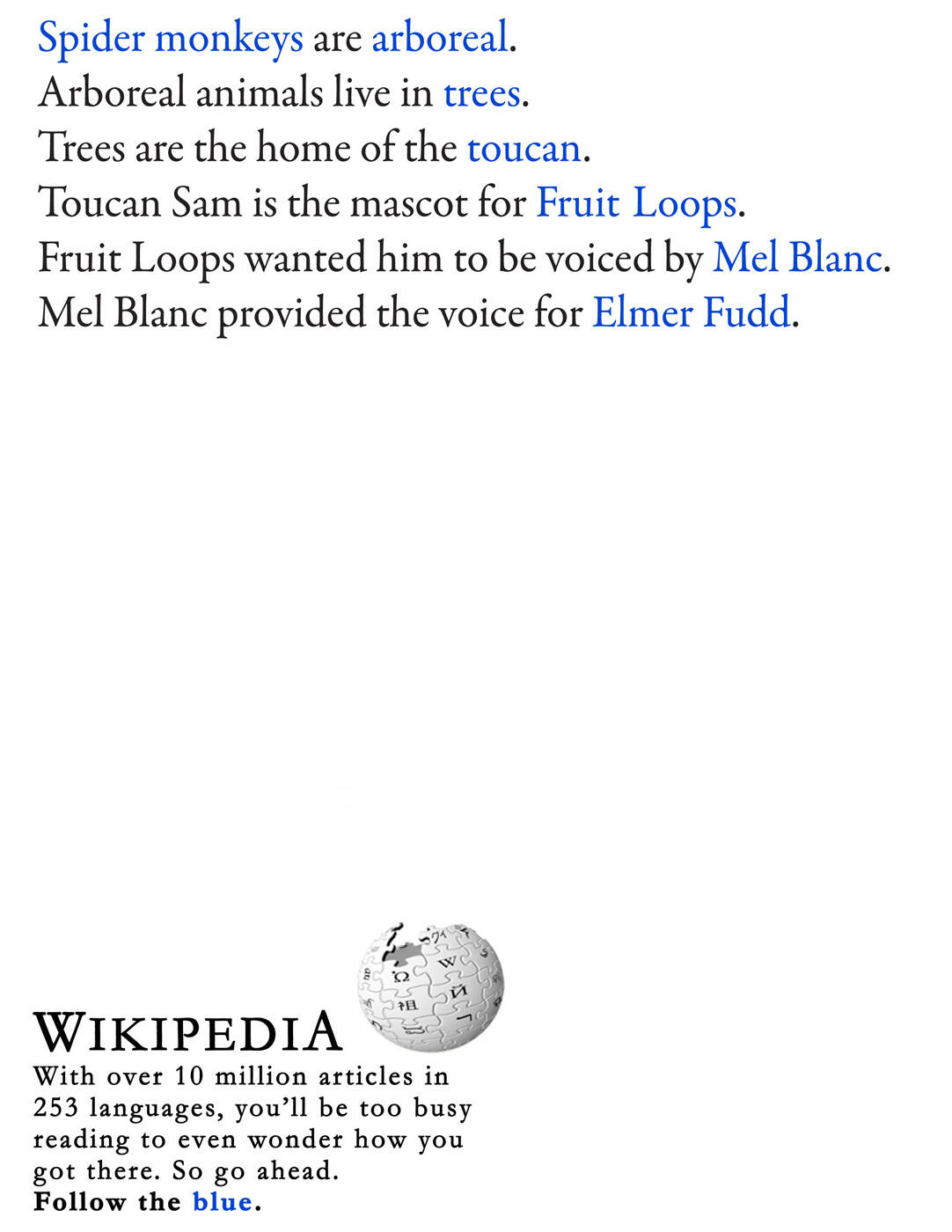 This professional campaign titled 'Jane, Elmer, Love' was published in United States in November, 2008. It was created for the brand: Wikipedia, by ad agency: The Creative Circus. This Print medium campaign is related to the Professional Services industry and contains 3 media assets. It was submitted about 17 years ago.