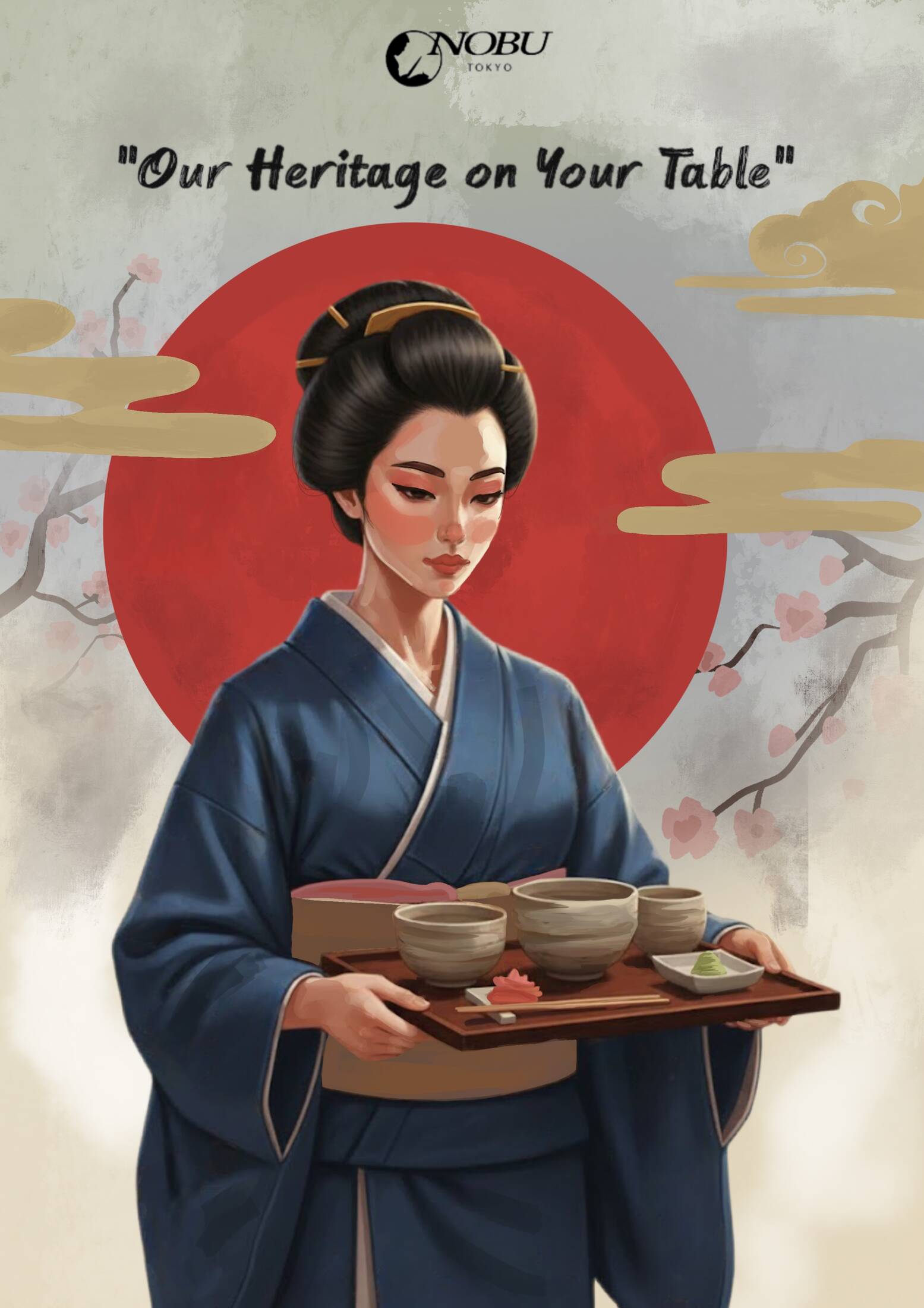 This poster represents Japanese heritage through the act of serving food, symbolizing respect, tradition, and cultural pride. It reflects how heritage is passed down and presented at the table with elegance.