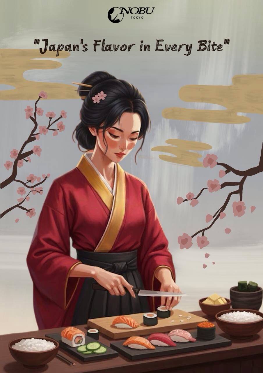 This poster highlights the craftsmanship behind sushi-making, showing precision, skill, and attention to detail. It represents Japanese cuisine as an art form where flavor is created with care and tradition.